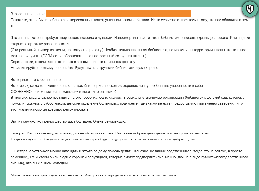Я предложил родителю в такой ситуации прежде, чем приступать к активным наступательным действиям, озаботиться защитой: реализовать комплекс мер, снижающих вероятность постановки ребенка на учет.