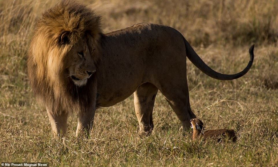Маленькая кошка выполнила задачу: котёнок убежал, а лев переключил своё внимание на другую цель.