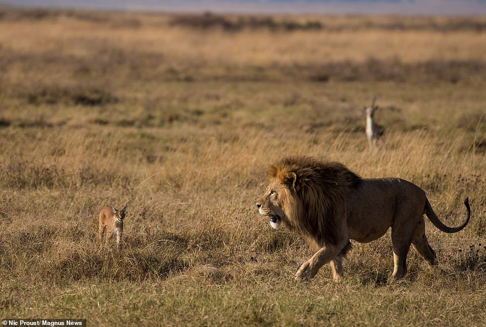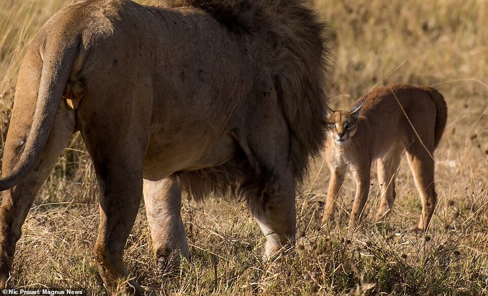 Давид и Голиаф: крошечный каракал и огромный лев в противостоянии, когда маленькое животное шипело и огрызалось на большую кошку.