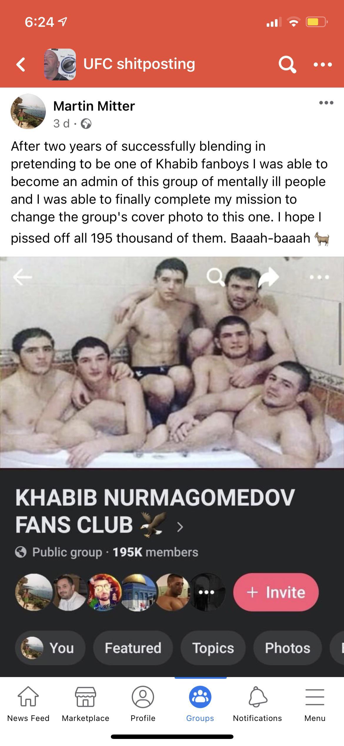 После двух лет успешного внедрения, претворяясь одним из фанатов Хабиба, мне удалось стать админом этой группы больных но голову людей и, наконец, завершить мою миссию и сменить заглавное фото группы на это вот. Я надеюсь, что выбесил все 195 тысяч участников. Бее-бее 🐑