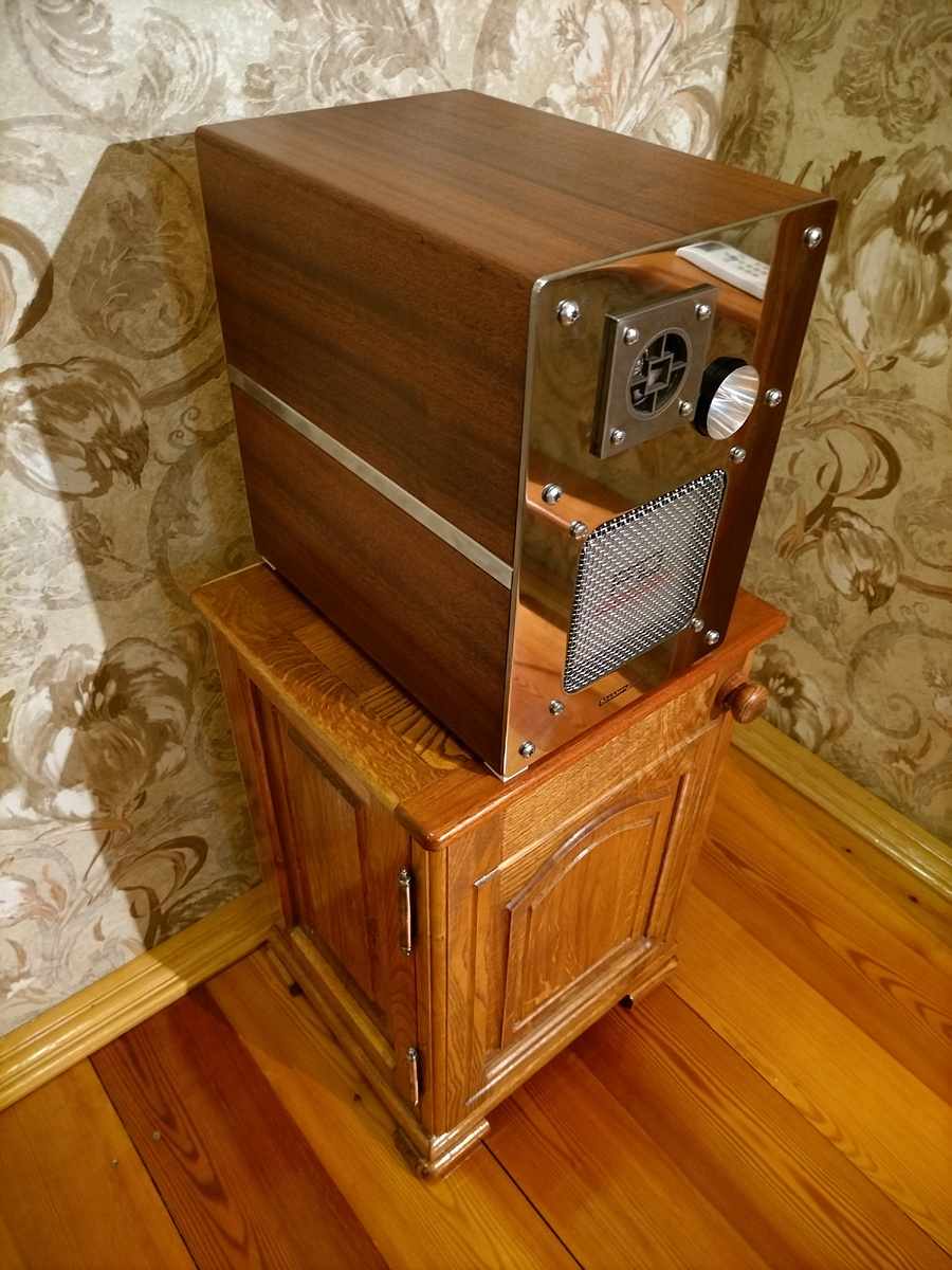 Сейчас Сергей делает колонки под этот аппарат. Чтобы всё было в одном стиле, переднюю панель сделал из нержавейки.