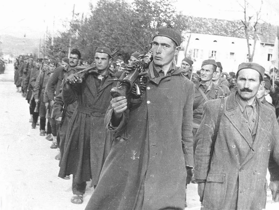 К фото - Основа партизанской армии Югославии - отличная горная пехота, носившая свои огневые средства на себе. НОАЮ пыталась активно применять бронетехнику, артиллерию и даже фронтовую авиацию, однако широкие возможности для этого появились у нее только в 1944-45 гг.