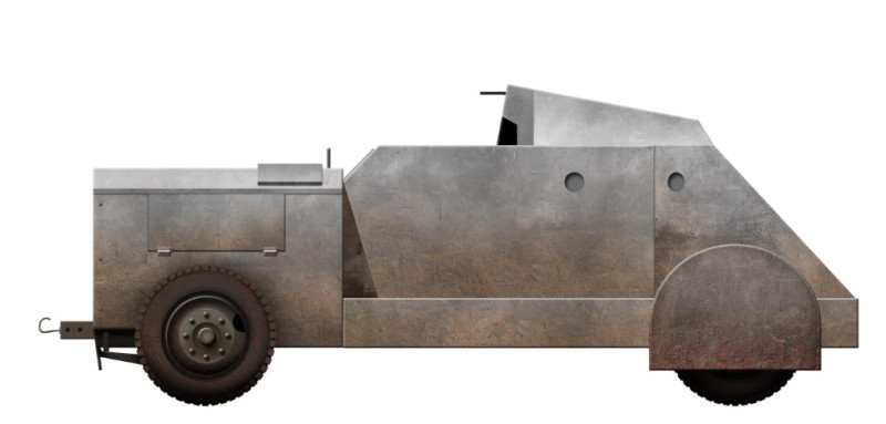 Вид сбоку на импровизированную партизанскую бронемашину. Эта фотография была сделана после ее захвата немцами; у машины отсутствует бронированный кожух передних колес. Обратите внимание на две круглых бойницы в правой бортовой броне.