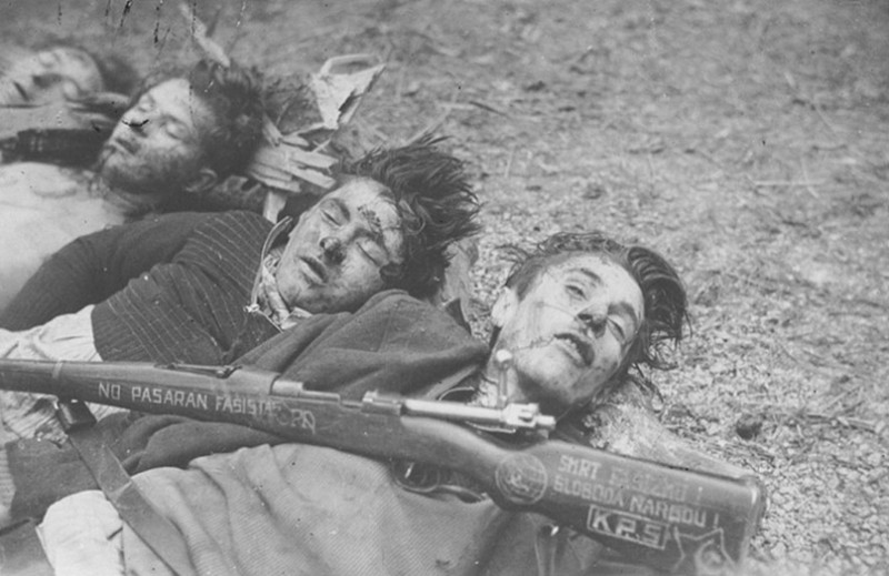 Жертвы югославских партизан в войне были очень велики, велика была и их самоотверженность. На фото - погибшие юные партизаны и их оружие, украшенное антифашистскими лозунгами, собранные карателями для устрашения.