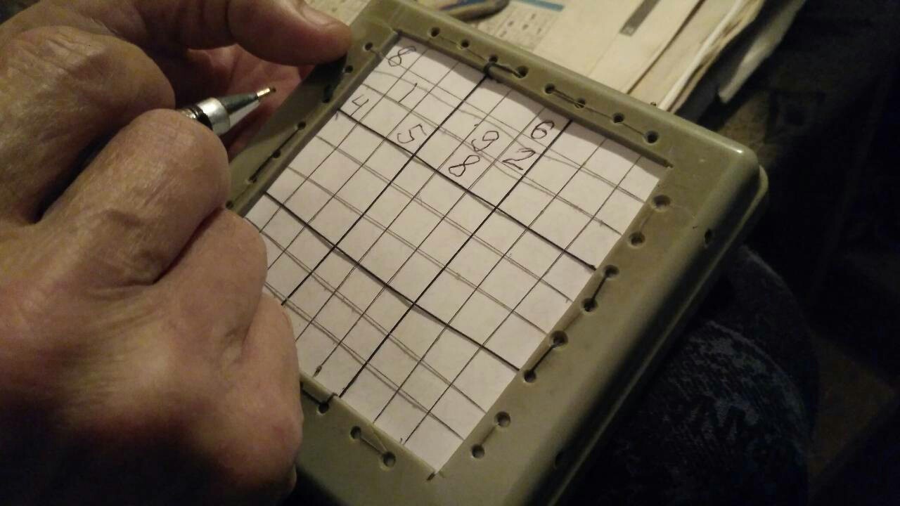 20 annpalna Самодельное судоку моего деда 8 лет назад Из крышки от тары для круп, ниток и листа А4. Вписывает цифры уже из решенного судоку из газеты, то есть, начиная по новой. Газет у него огромная стопка. [моё] Судоку Ручная работа Молодец Xiaomi redmi 3s
