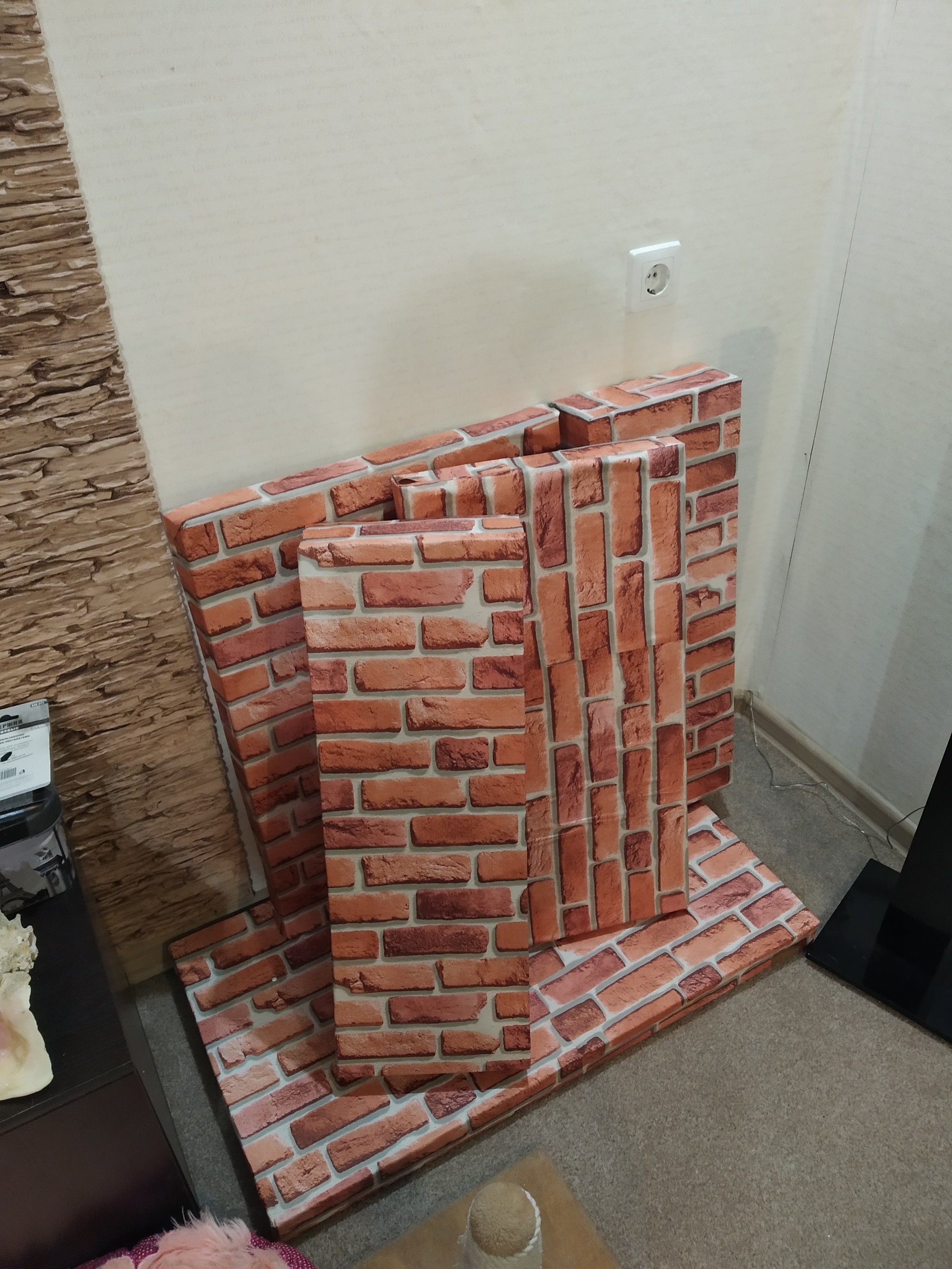 Изначально мной были куплены в сетевом строительном гипере 4 плиты пенопласта, по 73 р. и один рулон самоклеящейся плёнки, 45*200 см по 129 р. В средствах была весьма ограничена, поэтому так. Хотя можно было взять плиту и потолще, вышло бы ещё лучше. Когда пришла домой и начала делать предварительные прикидки, пришла к закономерному выводу, что я полная дура, так как с математикой и геометрией у меня без улучшений с годами, а всё так же плохо, как и в школе было)). Рулон плёнки закинут в дальний угол до других творческих порывов, а я сходила в ближайший строительный магазин, где на моё счастье были обои "под кирпичик". Куплен рулон обоев за 260 р. и клей ПВА за 89 р. Если честно, никогда не читала турториалов по самодельным каминам, только картинки посмотрела, поэтому всё покупала и делала потом "на глазок" и очень-очень быстро, чтобы запал не пропал.