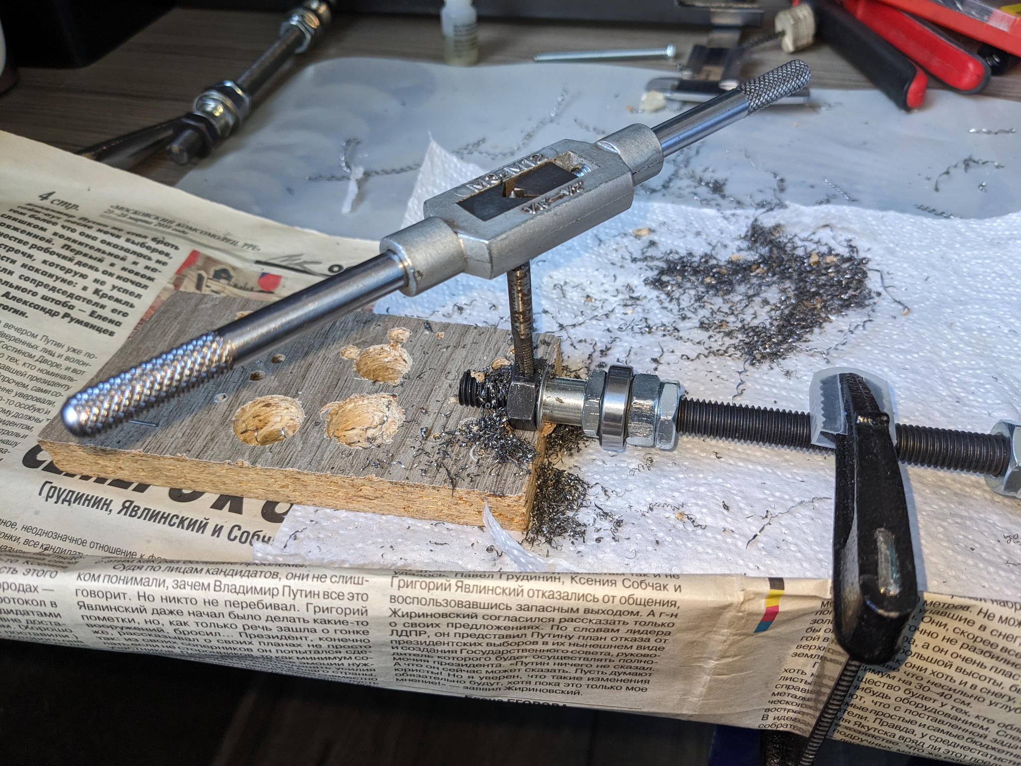 В черной гайке сверлится отверстие насквозь, потом режется резьба. Текст на газете не читайте, я хз откуда она у меня такая древняя :))