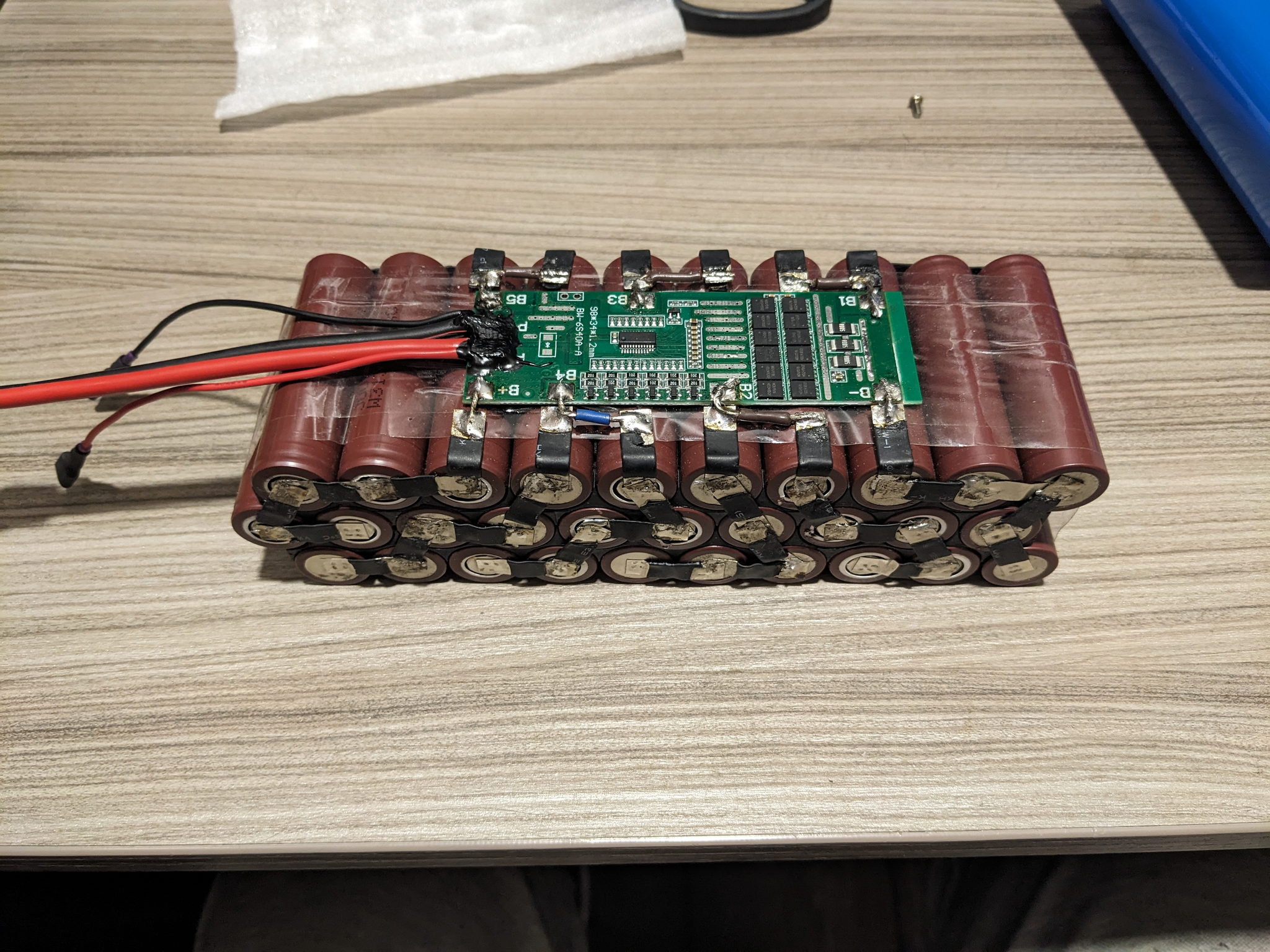 С батарейкой я сначала сел в лужу. Аккумуляторы 18650 же от 3.7 до 4.2в, и я решил, что 24в это 6 батареек последовательно, поэтому взял плату BMS 6s (на фото). И ходовые испытания показали, что снегоход еле едет, показатель зарядки проваливается при попытке газовать, в общем, полное разочарование. А немного поисследовав тот же алиэкспресс я выяснил, что батареи на 24в обычно маркируются 7s, и поэтому их реальное напряжение 29в. Поэтому заказал еще одну платку уже на 7s, и оно прям поперло ) Ну как, просто гораздо увереннее едет, везет даже 100кг меня со скоростью примерно 5км/ч :)