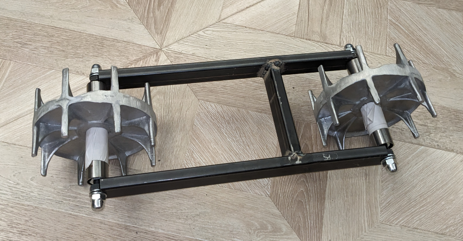 Колеса надеваются на трубу с внутренним диаметром 25 и надеваются на подшипники. Из 2мм стали выпилил круглые площадки для крепления колес и приварил к трубкам.