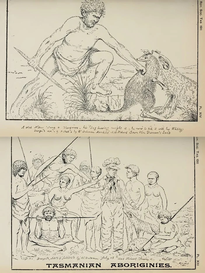 На верхнем рисунке XIX века изображен тасманийский абориген с метательной палкой