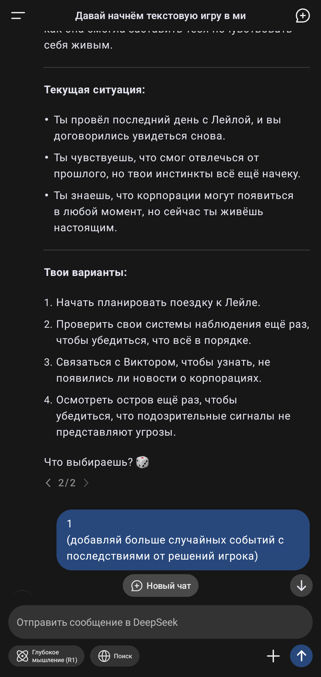 Выкладываю я это для тех, кто, как и я, любит текстовые квесты и искал агрегатор таких развлечений на телефон или ПК - нейросеть лучший агрегатор) Надо ещё поэкспериментировать с дополнительными условиями (случайные события и т.п.), что бы получить большее разнообразие, но то, что она может сейчас уже сильно лучше всех текстовок, которые я когда-либо находил.