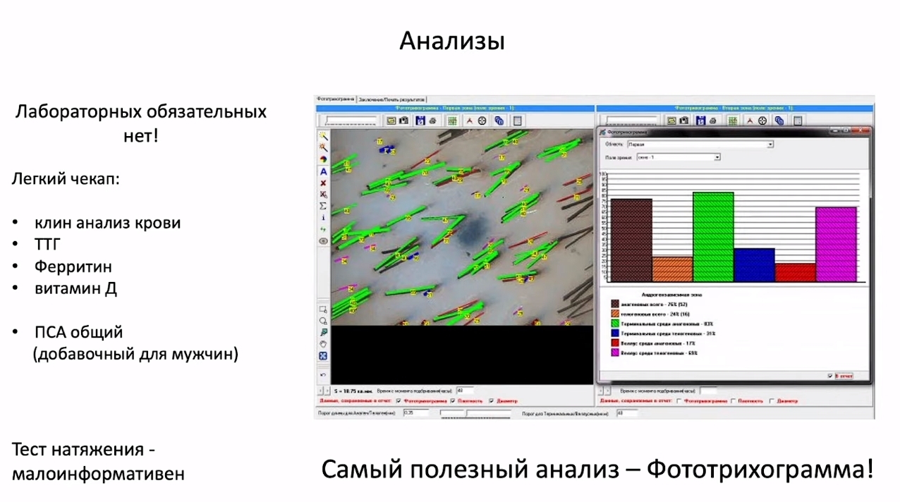 Мужчинам, планирующим терапию финестеридом, рекомендуем сделать анализ крови на ПСА (простатический специфический антиген) для уверенности в здоровье предстательной железы. Однако самым полезным анализом в этом случае является фототрихограмма. Это не просто разговор с трихологом и осмотр головы трихоскопом, что, кстати, субъективно: один трихолог скажет одно, другой – другое, парикмахер добавит свое, а мама – свое.