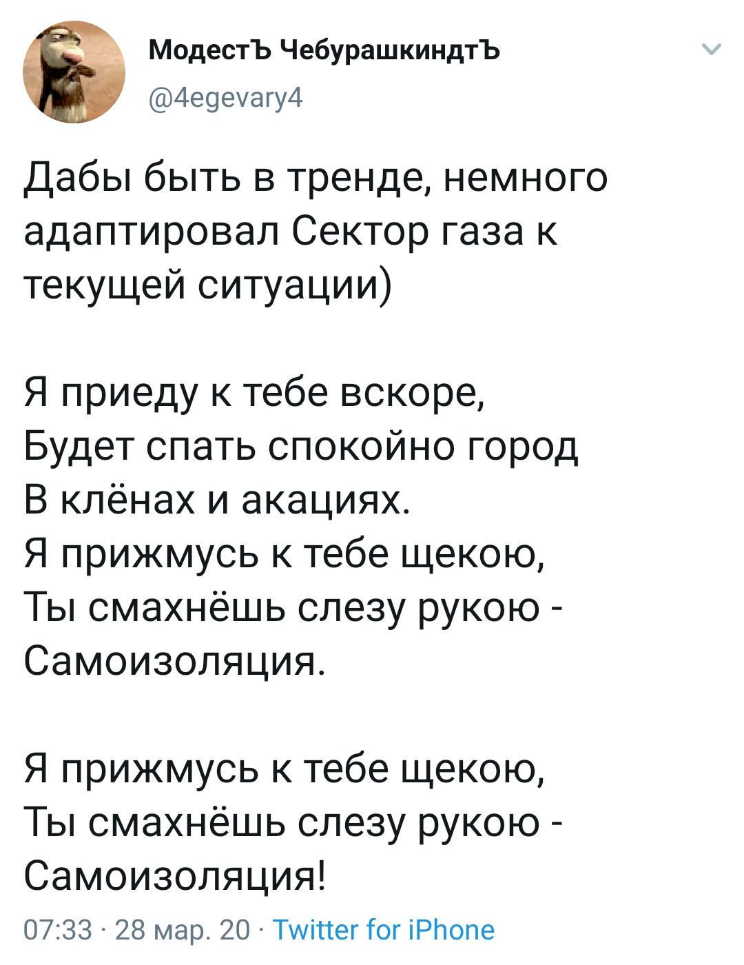 MidRW Самоизоляция 5 лет назад Песню в стиле "КиШ" уже придумали и даже спели, предлагаю теперь попробовать придумать в стиле Сектора Газа Сектор Газа (группа) Самоизоляция Демобилизация Коронавирус X (Twitter) Скриншот Ещё 0
