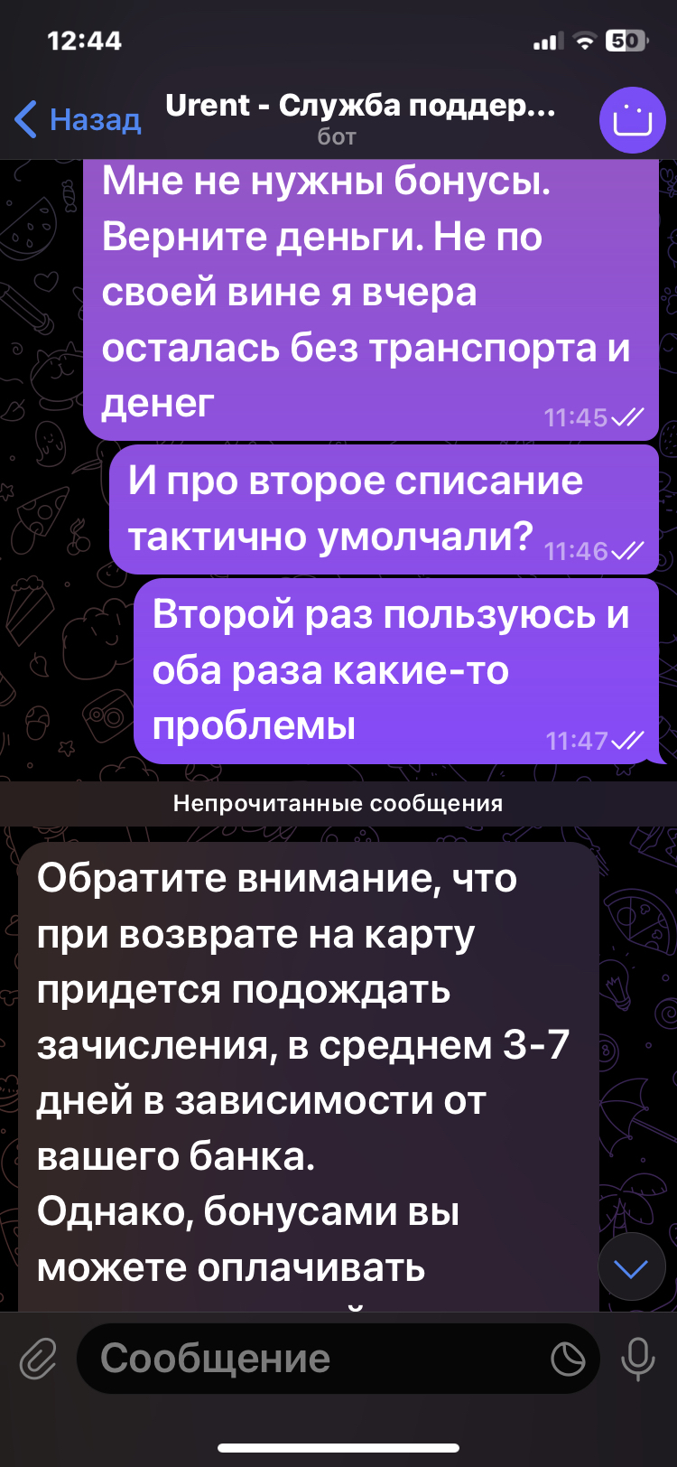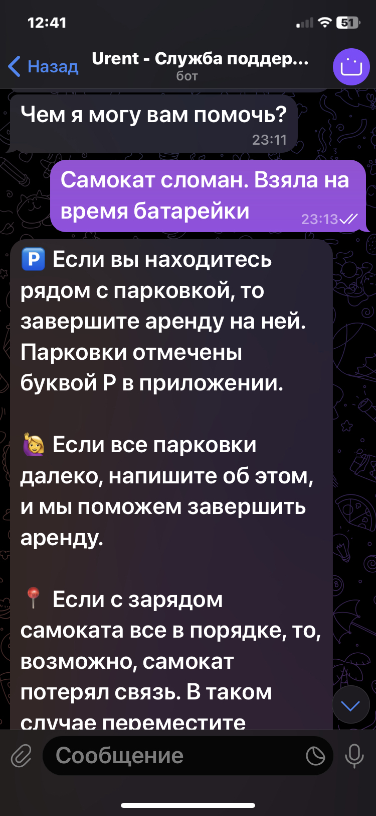 Появилась у этого сервиса услуга взять самокат на время, пока не сядет батарейка. В среднем это 4 часа и стоит 899р. Дождавшись позднего вечера, когда людей минимально, доехала до первого самоката со 100%. Я, убедившись что визуально самокат приличный, начала аренду. Метров через 200 стало дребезжать колесо. Сначала я подумала что это из-за брусчатки. Но когда выехала на ровную асфальтированную дорожку, дребезжание никуда не делось. И я написала в поддержку. А дальше началось вакханалия, которая закончилась только что. Если коротко, чтоб арендовать самокат за 900р, держите 1800) ибо и депозит (а когда он вернётся хз), и оплата поездки. А если вдруг самокат неисправен, то «нате вам бонусов вместо денег. Но не все. Нет. И вопрос решать будем максимально долго. Ибо у нас нет горячей линии. И даже не извинимся.»