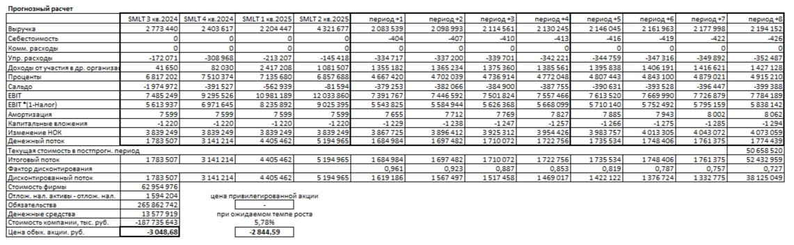 Наш прогноз опирается на детальный поквартальный анализ отчётности по РСБУ с 2022 по II квартал 2025 года. На этом основании мы строим двухлетнюю модель с консервативным темпом роста в 3% годовых. Ставки дисконтирования (12,65% в USD и 15,46% в RUB) заимствованы из авторитетного источника — Банка России.