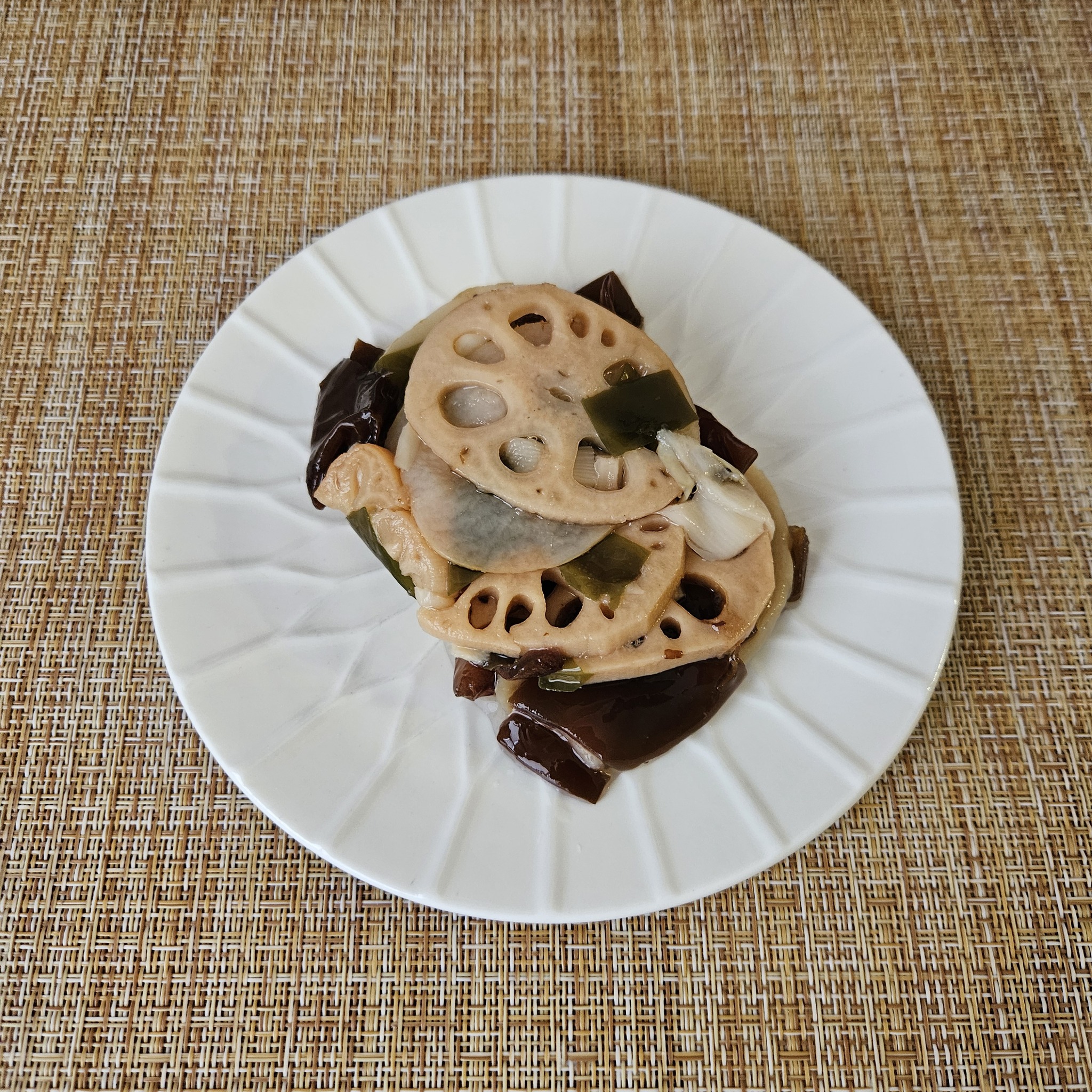 Маринованные овощи в стандартной комплектации. В основном корень лотоса. Также имеем картофель, грибы и водоросли.