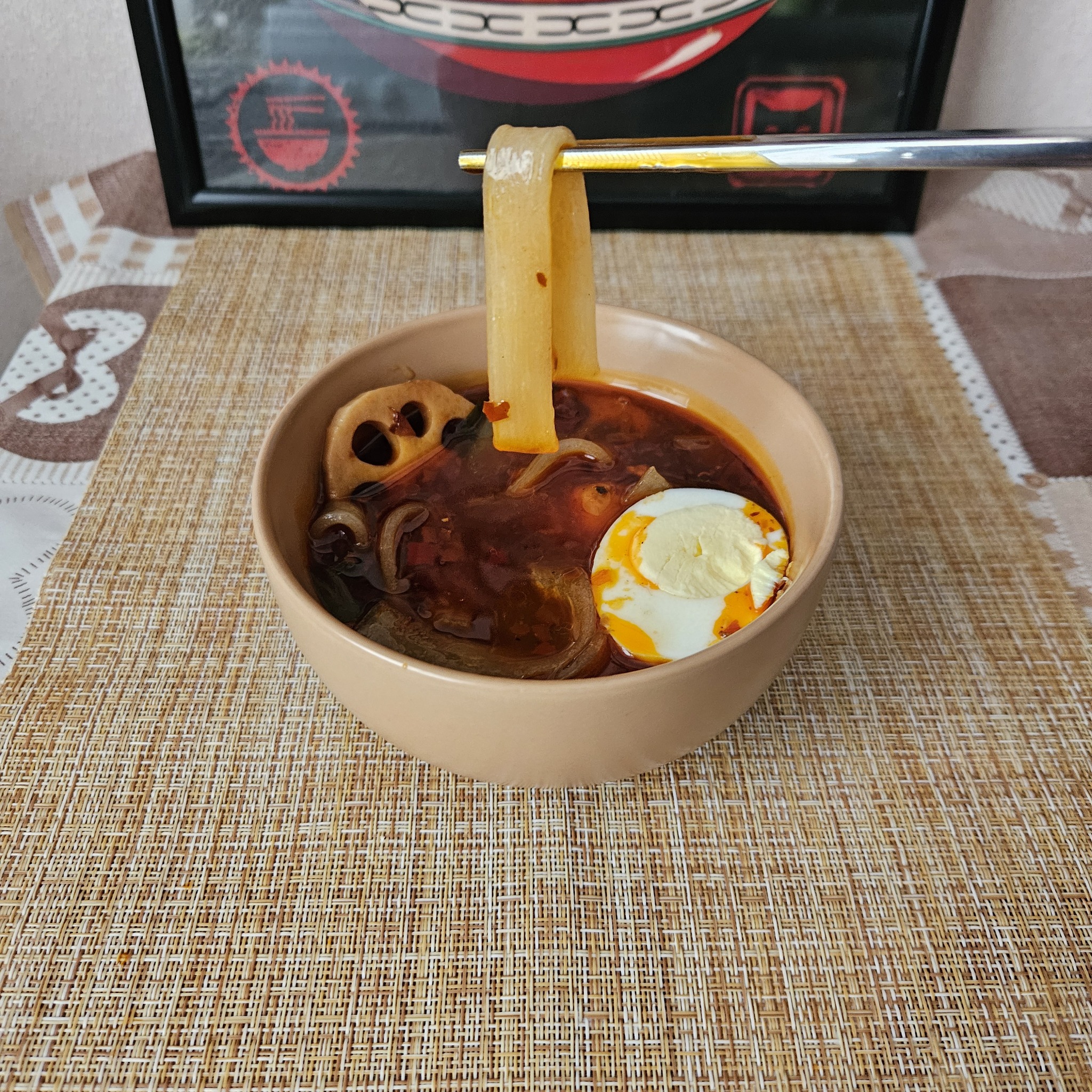 Бульон, как видно на фото, ядрёный. Жирнющий, красно-коричневый, очень пачкающийся. По запаху Сычуань на максималках. По вкусу тоже. Очень пряно и остро. Думаю, никак не меньше 5-6 островатт, а то и больше. Оправившись от первого удара по рецепторам, пробуем остальные составляющие. Корень лотоса хрустящий. Картофельные ломтики почти без хруста. Вкусные. Грибы и водоросли вполне съедобные. Сосиски понравились, но их очень мало. Лапша склизкая, палочками подцепить трудно. Жуётся с трудом, на вкус не очень. Соус ещё очень коварен тем, что при комнатной температуре моментально оседает в твёрдом виде на посуде и отказывается отмываться без приложения солидных усилий.