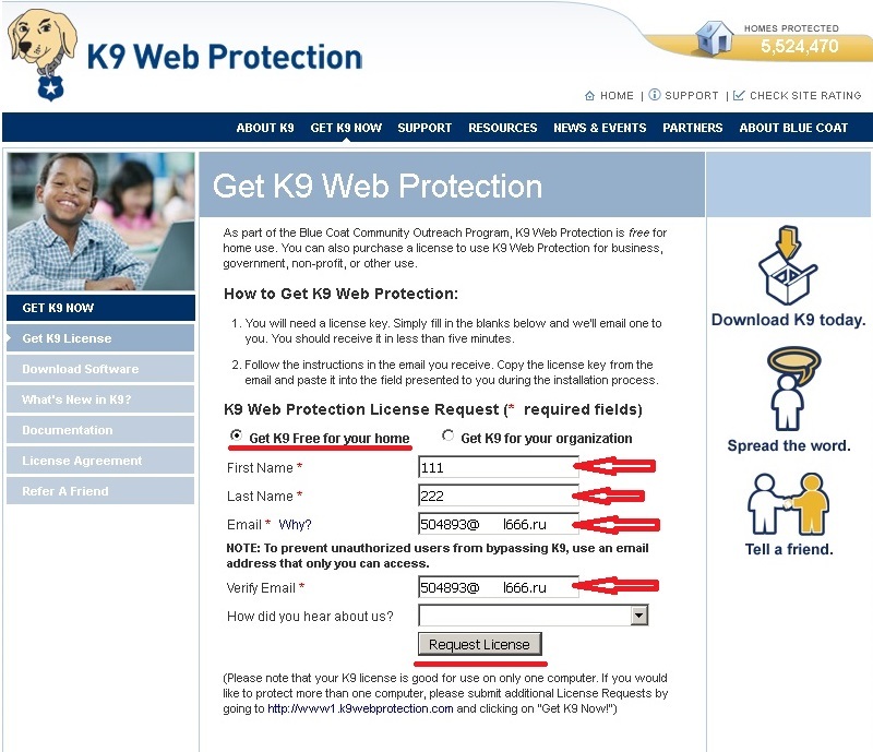 - Далее жмем на ссылку, вводим данные на сайте, чтобы получить лицензию на почту;