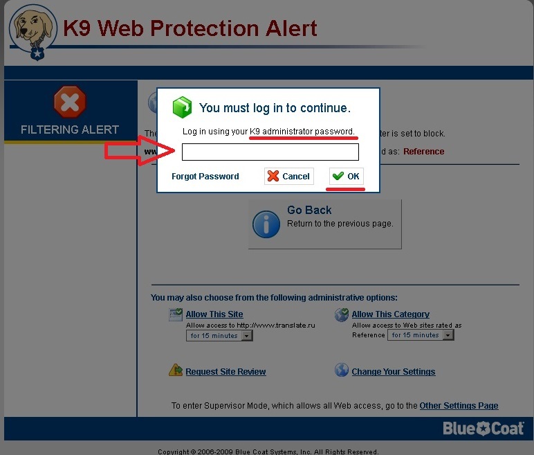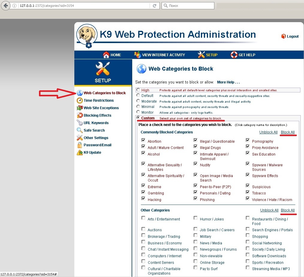 Web Categories to Block – Веб-категории заблокированы - важная настройка категорий, которые буду блокированы, какие-то можно разрешить, а можно блокировать все. Вообщем-то предлагаю всё заблокировать, а потом с помощью других опций (что ниже) сделать свой список доступных ресурсов. Ниже будет пример картинки, что появиться, если зайти на блокированный сайт. Администратор, введя пароль, может открыть временный доступ к нужному сайту или нужной категории.