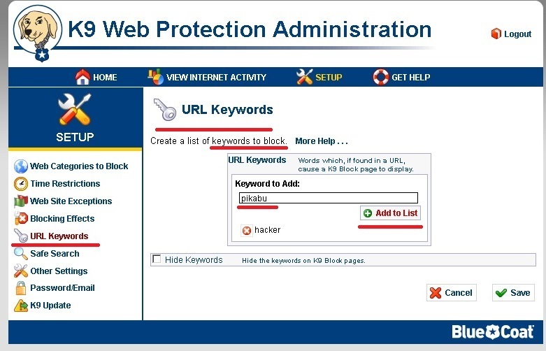 URL Keywords – слова в адресе. Очень важная штука, можно вписать имена, по которым будет идти блокировка сайтов, можно сделать большой список, чтоб прям наверняка. (Удалить сайт из списка можно с помощью маленького крестика рядом с именем)