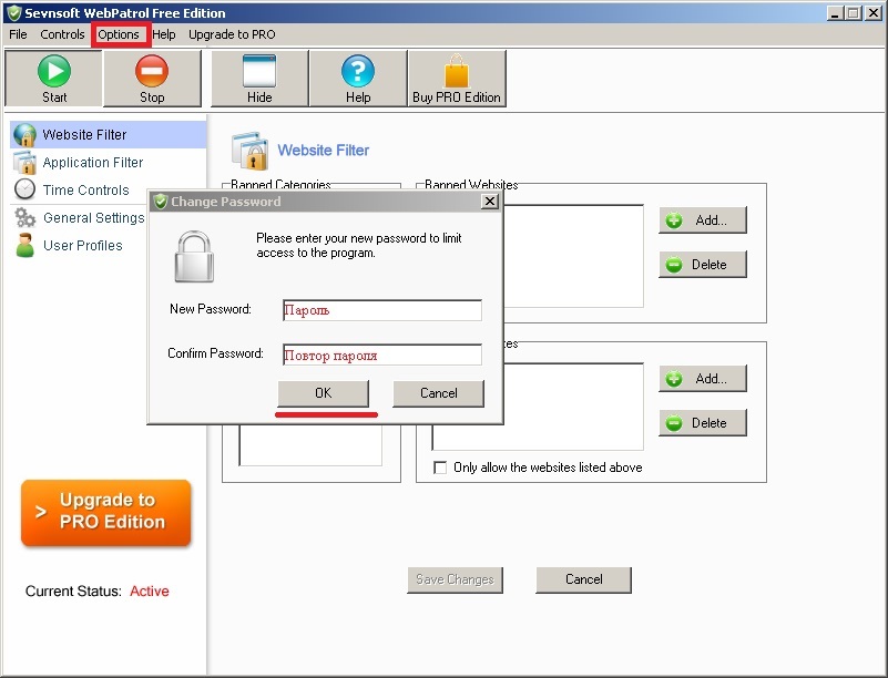 _В появившемся окне ищем вкладку Options > Set Password > Вводим придуманный пароль в верхнюю и нижнюю строчку одинаковый, жмем ОК. Только не забудьте его =)