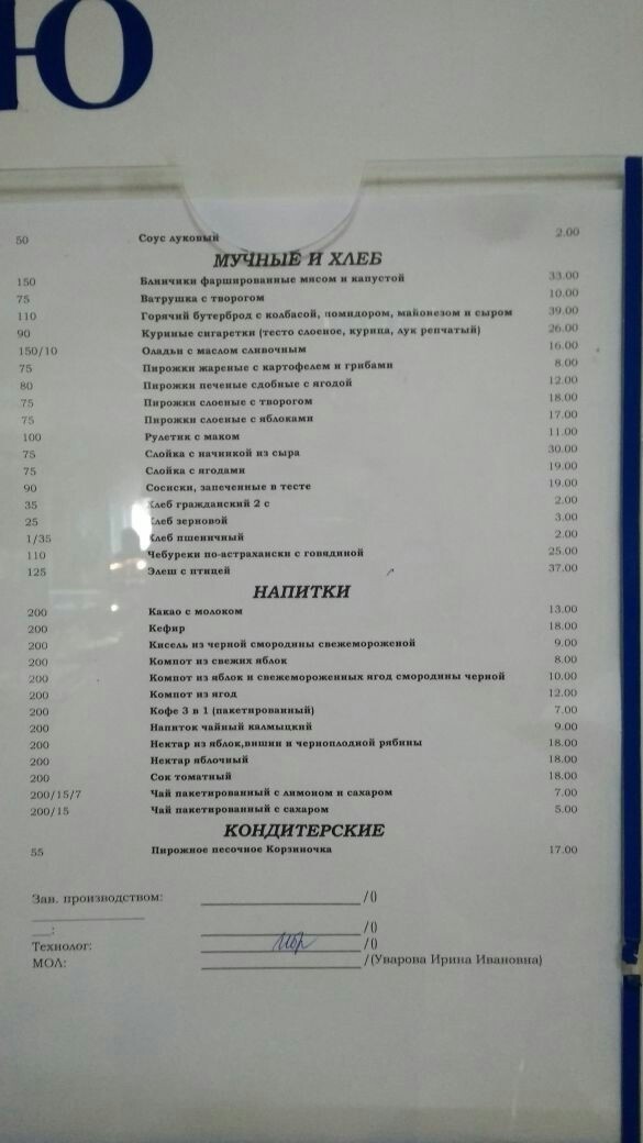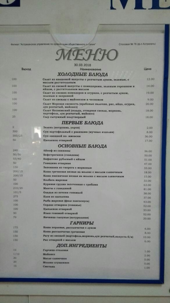 Лента. Обед 25 рублей, полдник 5 рублей. Выбор блюд, первое, второе, третье. На полдник каша и выпечка