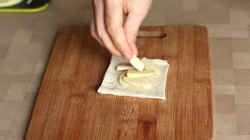 Положите на один кусок несколько тонких ломтиков яблока, посыпьте сахаром и добавьте маленький кусочек сливочного масла.