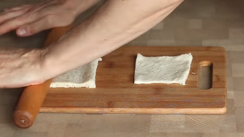 У хлеба срежьте корочки со всех сторон и скалкой раскатайте его до тонкого состояния.