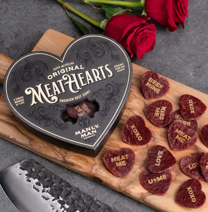 Если дарить шоколад — не в вашем стиле, почему бы не заменить его мясом? Meathearts — это сушёная говядина в форме сердечек с романтичными посланиями, отсылающими к мясу («meat me», «beef mine», «u+me»).