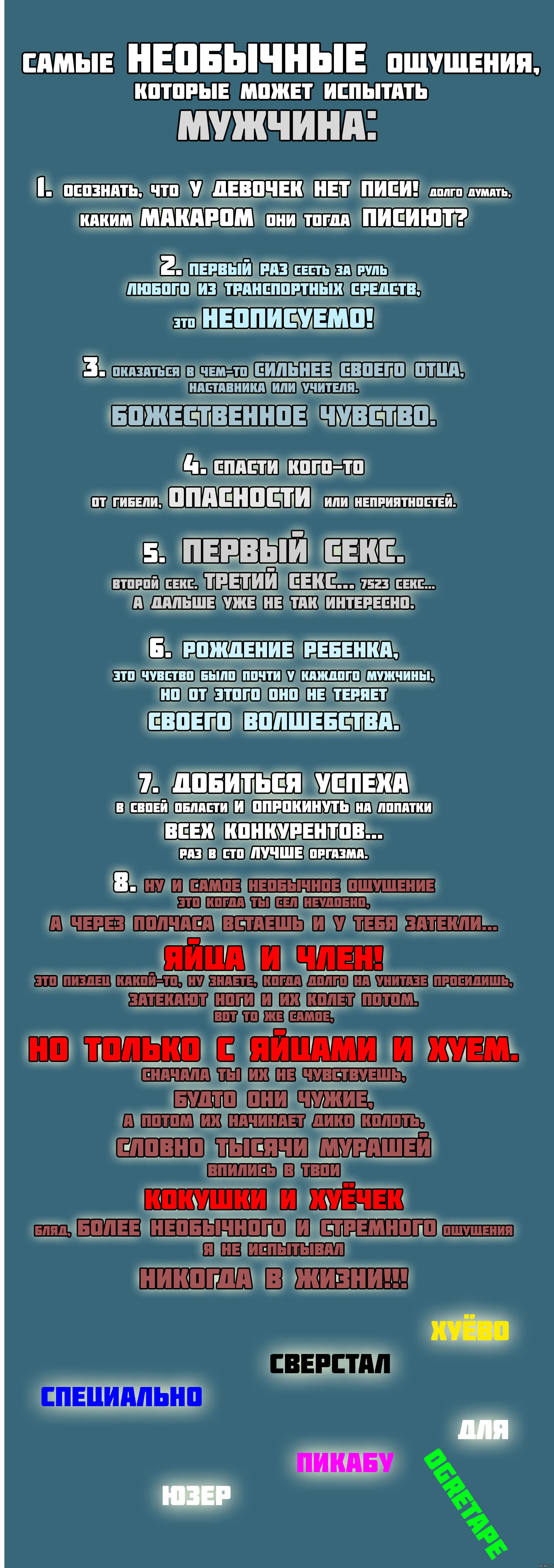 999 Небезопасный контент (18+) Авторизуйтесь или зарегистрируйтесь для просмотра Otape 18+ Самые необычные ощущения, которые может испытать мужчина 13 лет назад Длиннопост!!! 18+ [моё] Общество