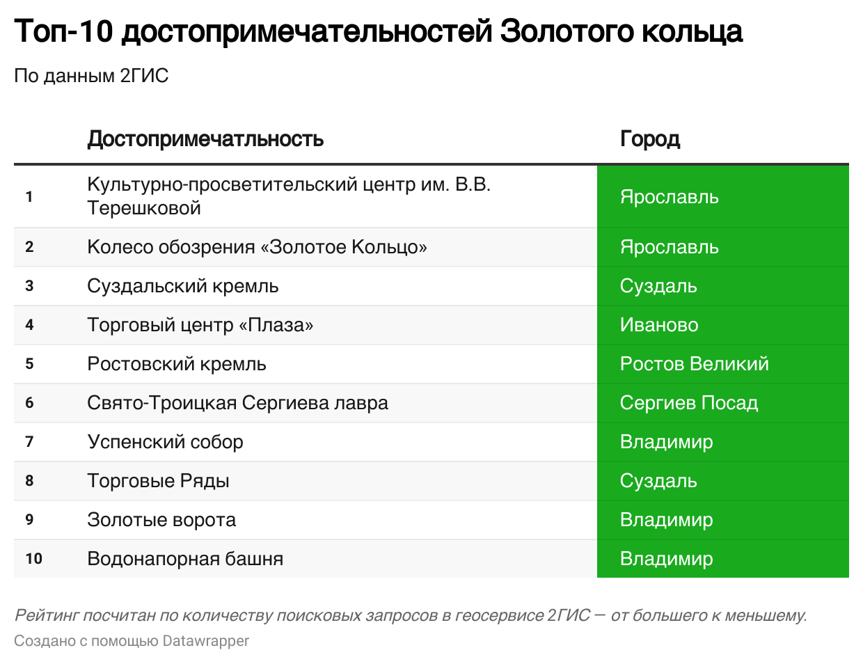 Вот итог — топ самых популярных объектов Золотого кольца, по версии пользователей 2ГИС. Чаще всего на карте искали Культурно-просветительский центр им. В.В. Терешковой и колесо обозрения «Золотое кольцо» в Ярославле, а ещё Суздальский кремль.