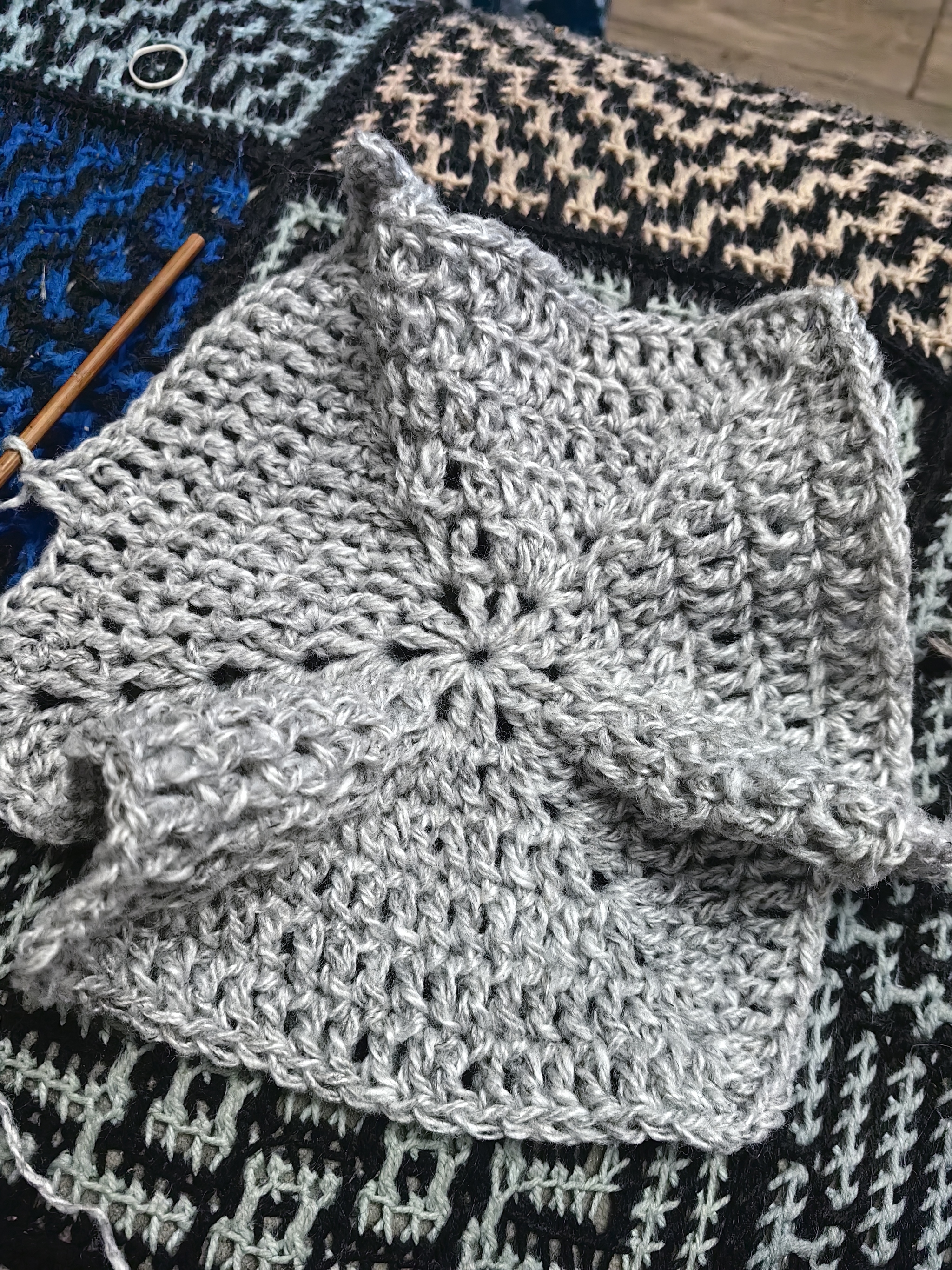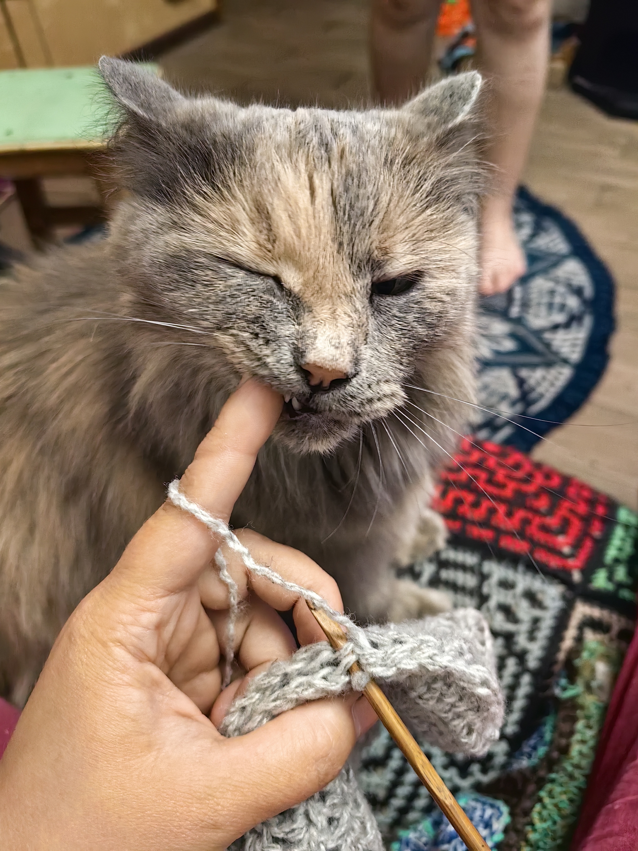 Летом, при отключённом тёплом поле сильно мёрзнут ноги. Поэтому зимой я всегда босиком, а летом в теплых носках. Сын внезапно вырос из своих старых, поэтому в срочном порядке, отложив основной процесс было решено вязать новые экспериментальные носки. Я сейчас вяжу кардиган в такой же технике и рука уже привычна.