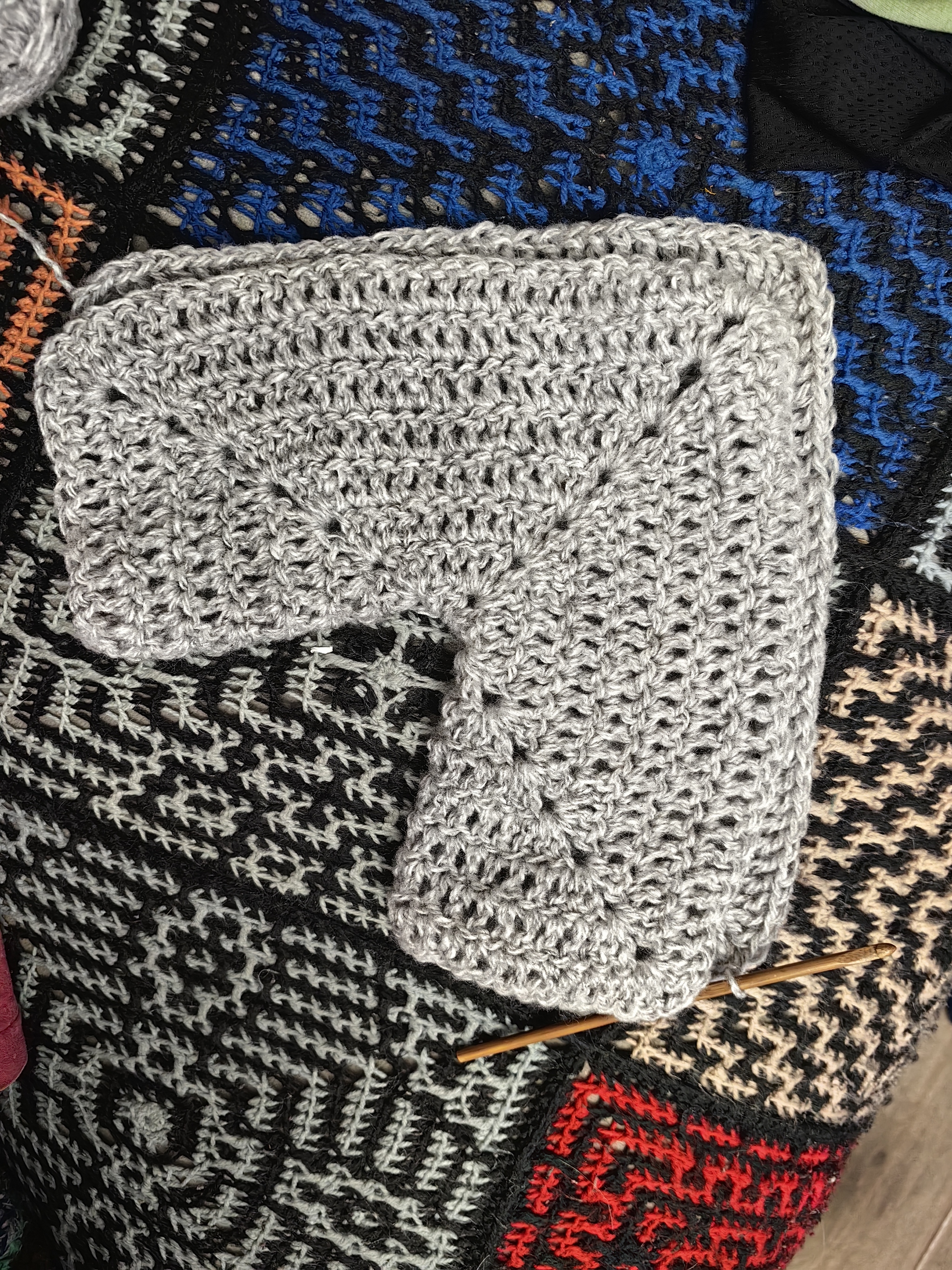 Суть в том, что мы берем любой квадратный мотив, который вяжется из центра и вяжем на два клина больше. Главное, чтобы угол между клиньями составлял 90 градусов. Этого можно достичь провязывая в угол арку из двух столбиков с накидом, двух воздушных петель и еще двух столбиков с накидом. Либо, если вы вяжете столбиками без накида - один столбик, две воздушных, один столбик. Вяжем до тех пор, пока одна из сторон не будет плотно обхватывать ногу, свобода добавится позже за счет соединения.