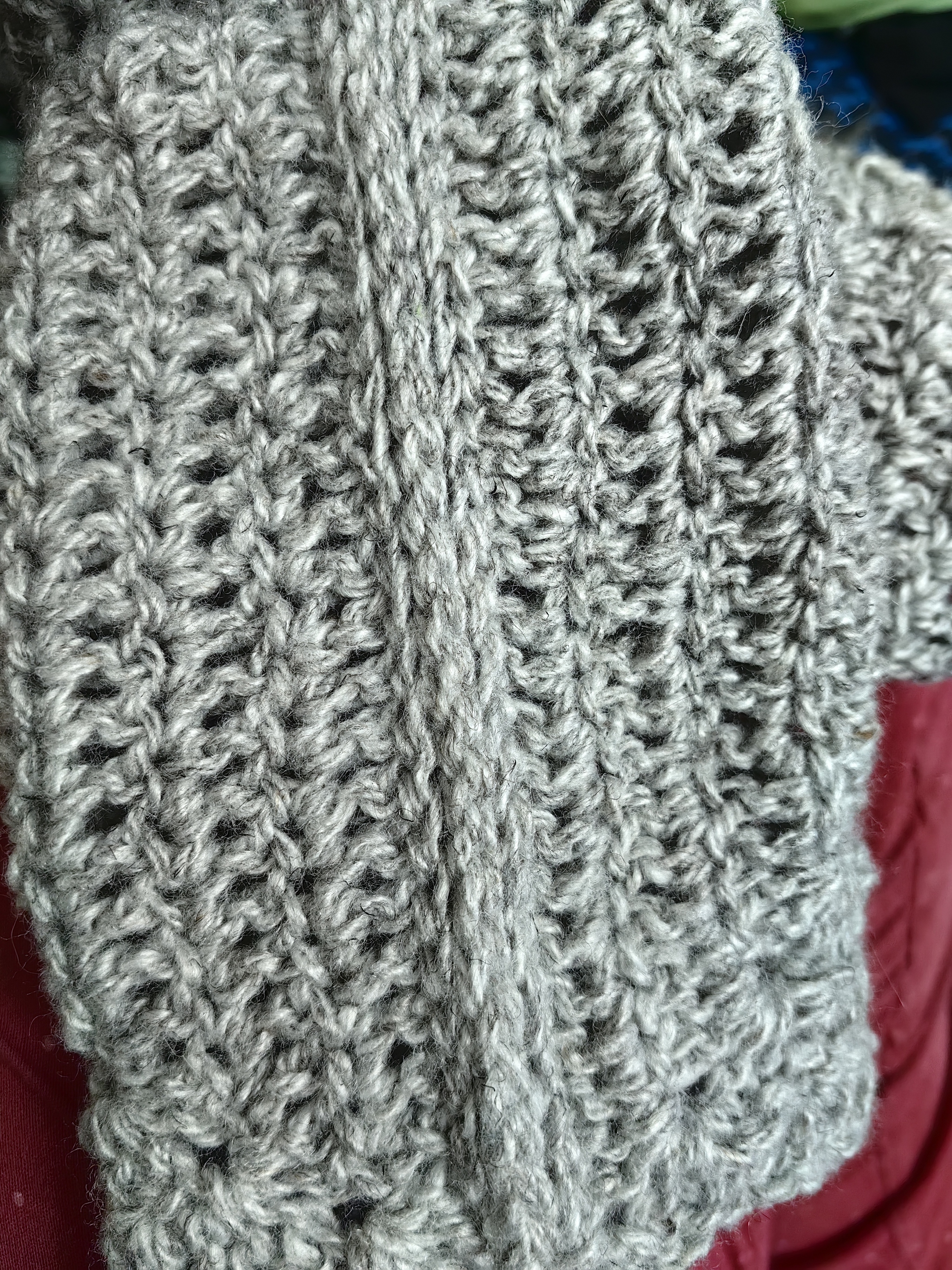 Не забываем что нам надо оставить две дырки, одна, куда засовывается нога и вторая вывязать мысок. Мысок я вязала столбиком без накида сначала за одну петлю, потом за две сразу, чередуя так по кругу, пока вязание не замкнулось, затем обрываем нить и с другой стороны вяжем обычную резинку рельефными столбиками. Если кто не знает, то это когда крючок не втыкается в петлю а обхватывает столбик предыдущего ряда. Лицевой - спереди, изнаночный - сзади.