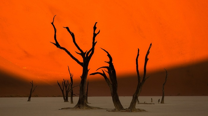 Рядом с большим папой расположилась знаменитая мертвая долина. Долину держит в кольце оранжевый песок дюн. Ее ровная поверхность покрыта белой гладью соляной корки, на ней — изогнутые сухие деревья, распахнувшие вечности свои черные объятья.