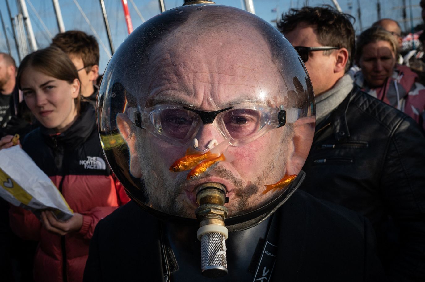 22. Мужчина в аквариуме и золотыми рыбками перед стартом парусной гонки Route du Rhum в Сен-Мало, Франция, 1 ноября 2022 года
