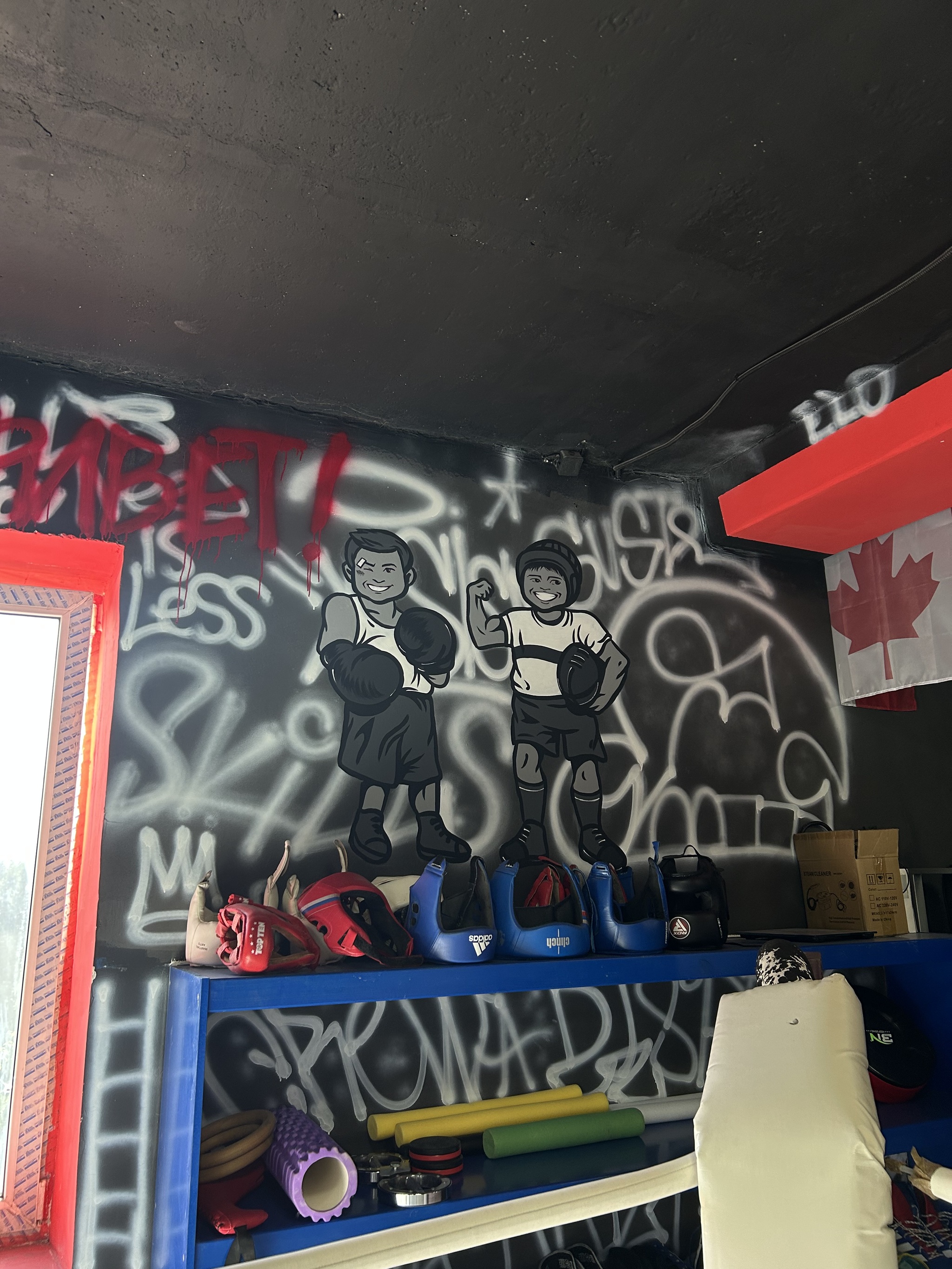 Написал владелец-тренер зала по боксу (ранее делал заказы). Сделала макеты, приехала в темное время суток чтобы проектором скопировать рисунок на стену. Мне было сложно такой рисунок делать, правда, но было любопытно попробовать
