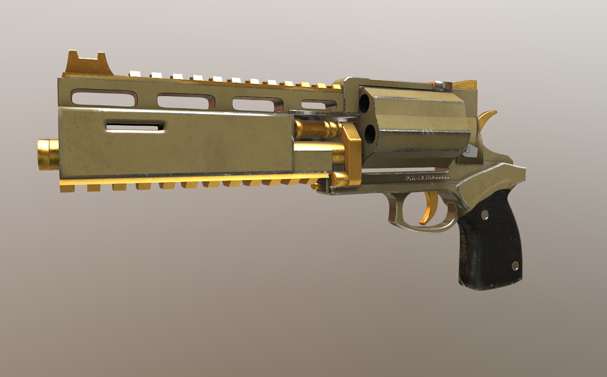 Оружие представляет собой массивную конструкцию с барабанов в угловом положении и большим стволом. Оно даже внешне схоже с револьверами из художественных картин, которые представляют фантастику. В барабане пять патронов. Он откидывается в левую сторону.