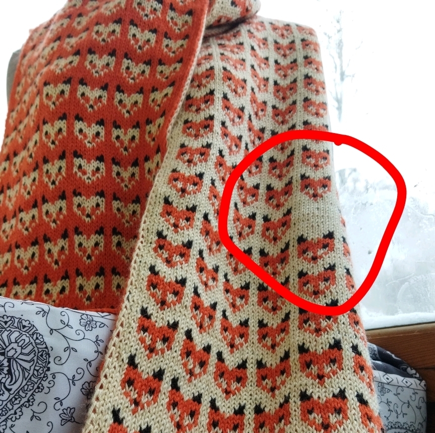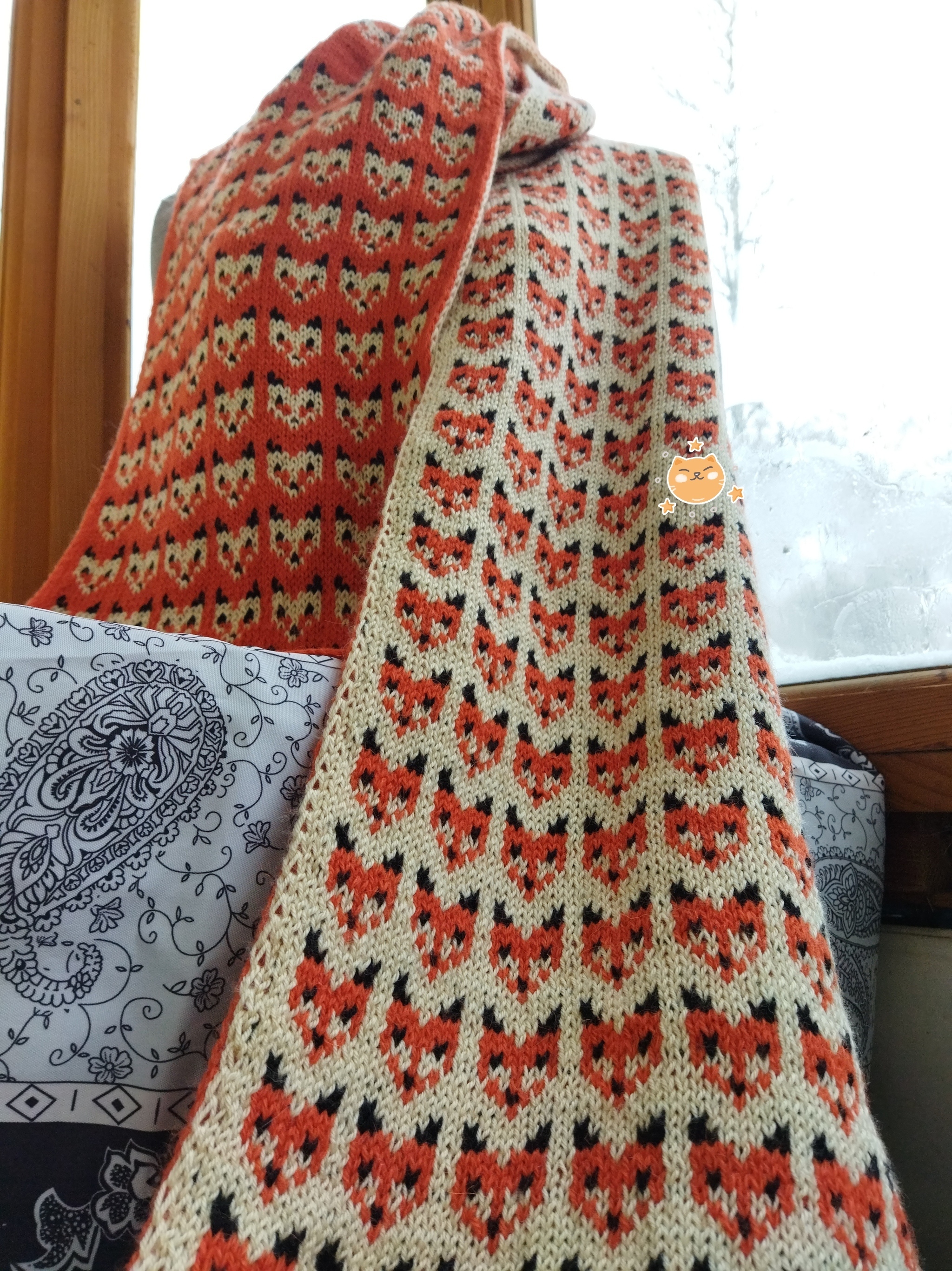 Самый любимый из всех на текущий момент. Один из самых сложных в исполнении. Двухсторонний жаккард в три цвета, спицы тройка, пряжа турецкая и Семёновская. Метраж более 2,7 метра. Ровно тысяча лисьих мордочек, по одной на каждый год жизни Кумихо.