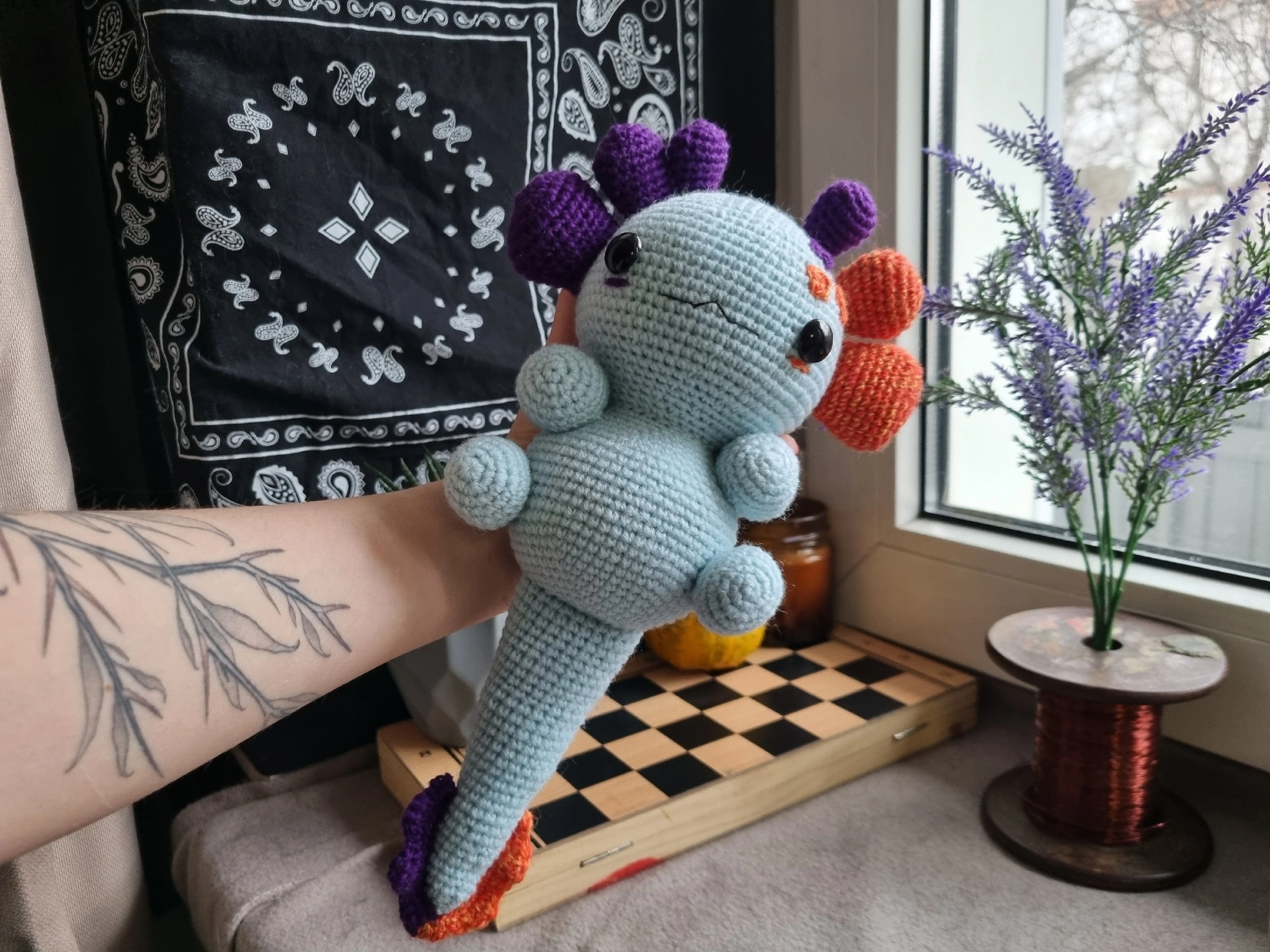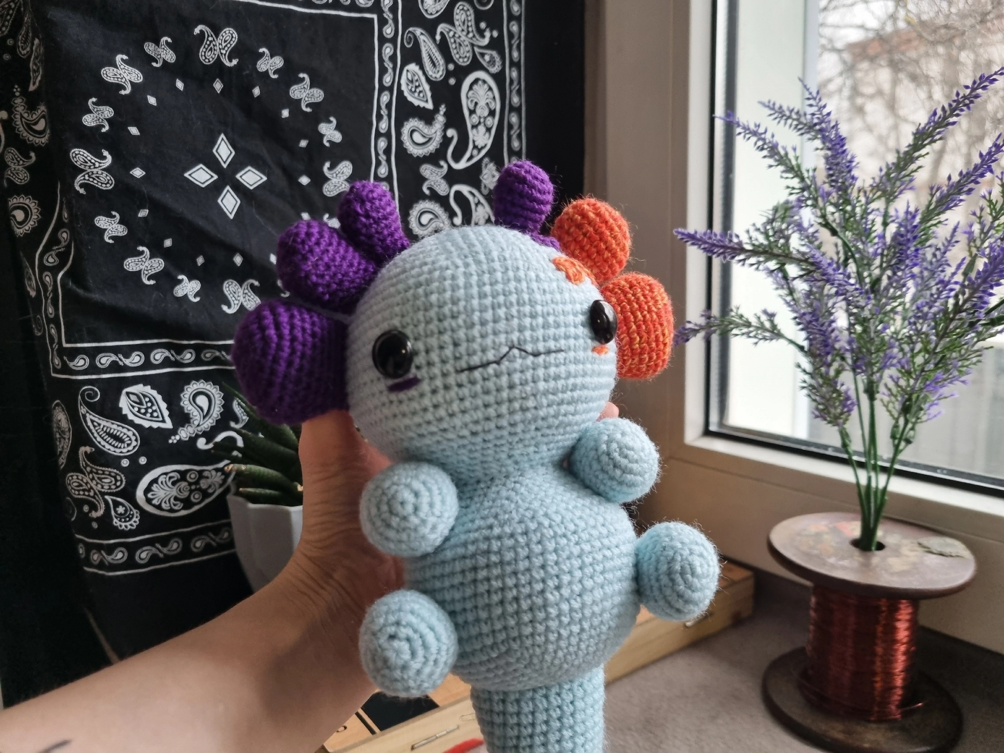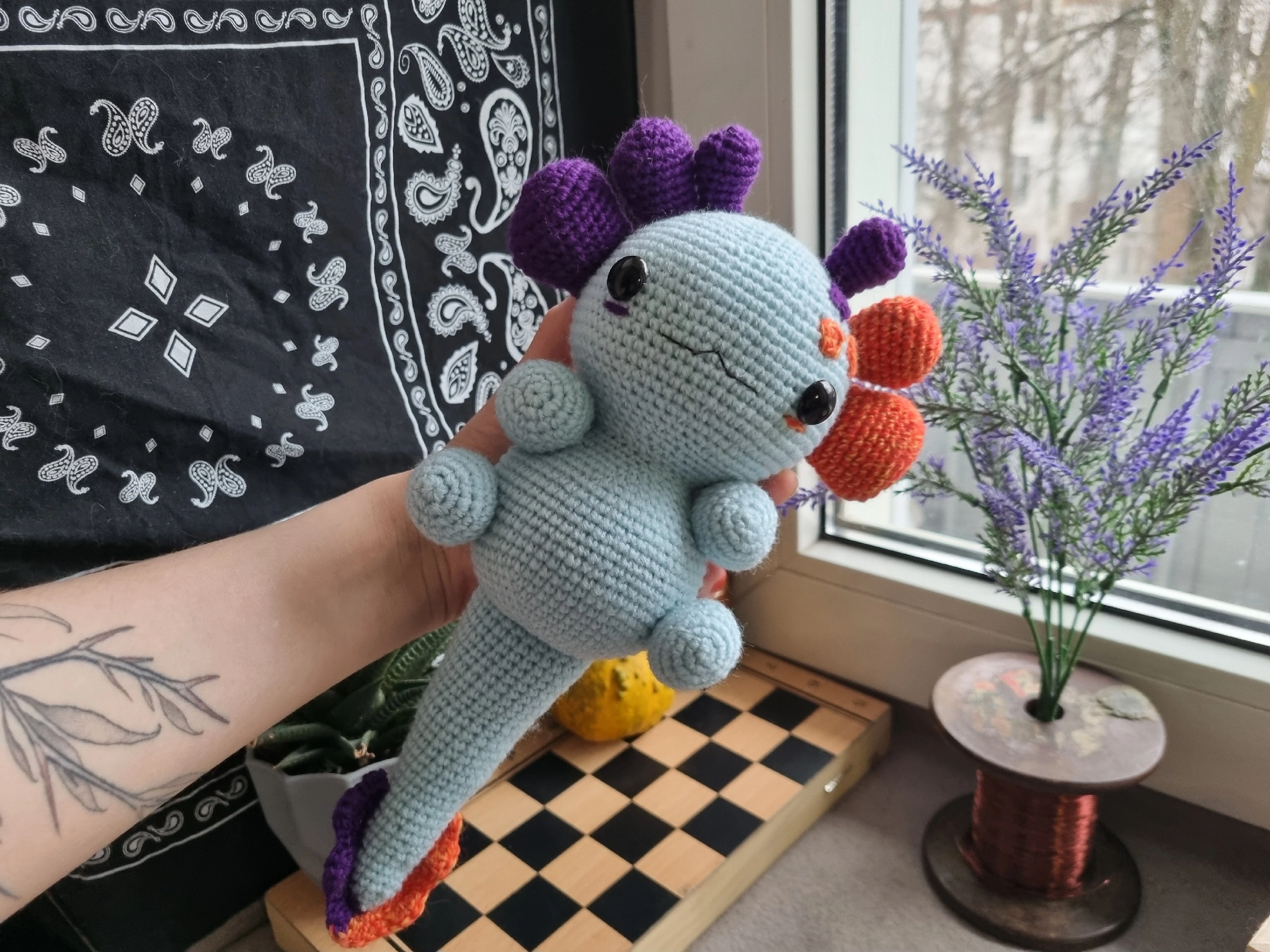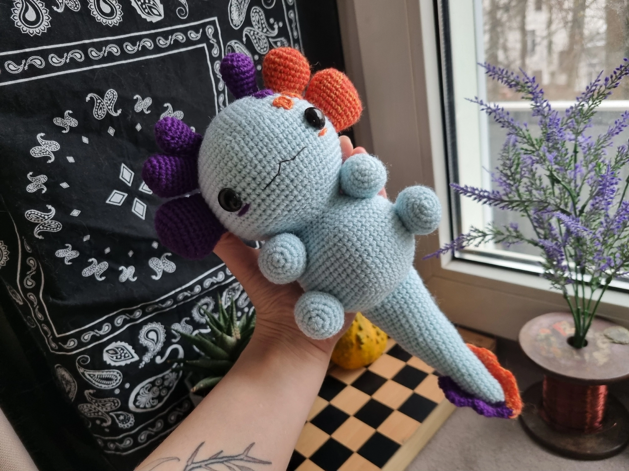 У меня заказали аксолотля, но это самый необычный большой аксолотль, которого я вязала.