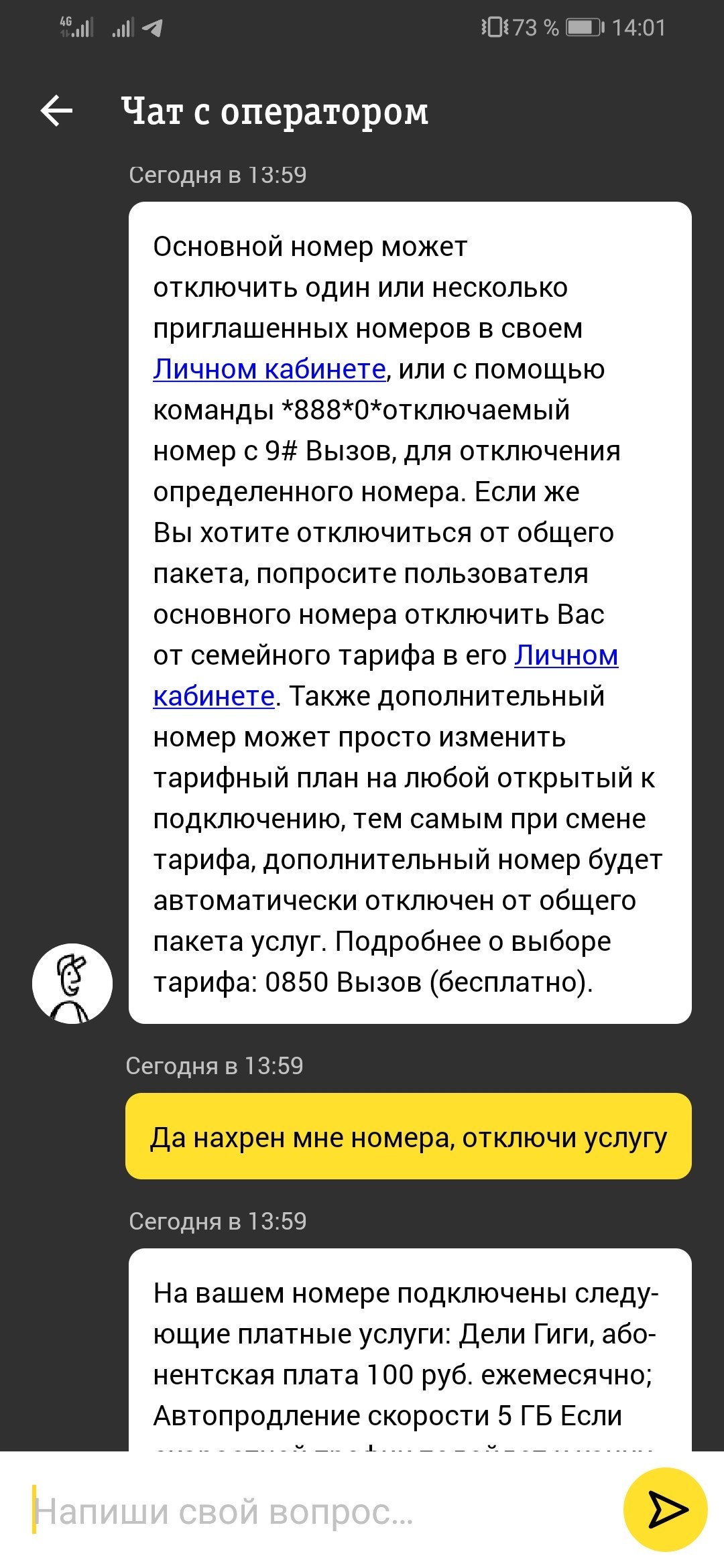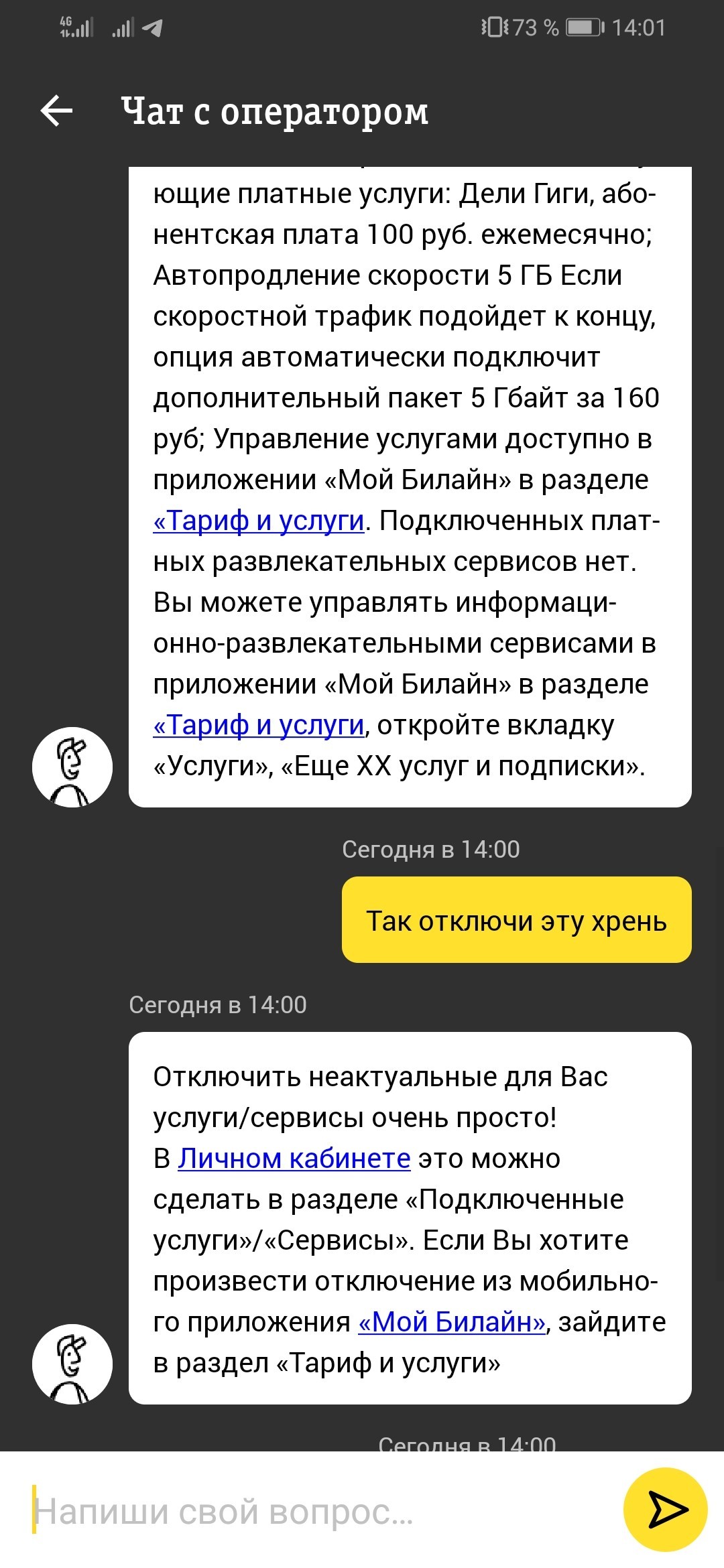 В продолжение постов про операторов связи. На этот раз "порадовал" Билайн. Месяц назад переехал в другой город и купил местную сим-карту, все устраивало и связь и домашний интернет, но когда пришёл день абонентской платы, я вдруг ушёл в минус на 100 рублей, хотя все было рассчитано, в детализации оказалось списание за услугу ДЕЛИ ГИГИ в размере 100 рублей, в приложении не нашёл ни одного упоминания о ней, до оператора не дозвониться, а супер полезная хрень под названием "чат с оператором" вот что мне выдала, я понимаю что эти чаты скорее информативные, но толку от них 0