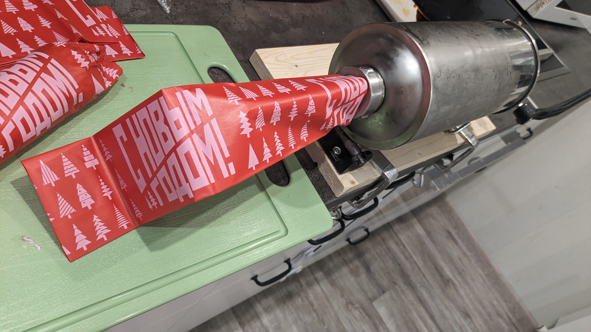 Затем фарш я перекладываю в колбасный шприц. В качестве оболочки взял ту, что осталась от новогодних колбас(так же от емколбаски мембрин).