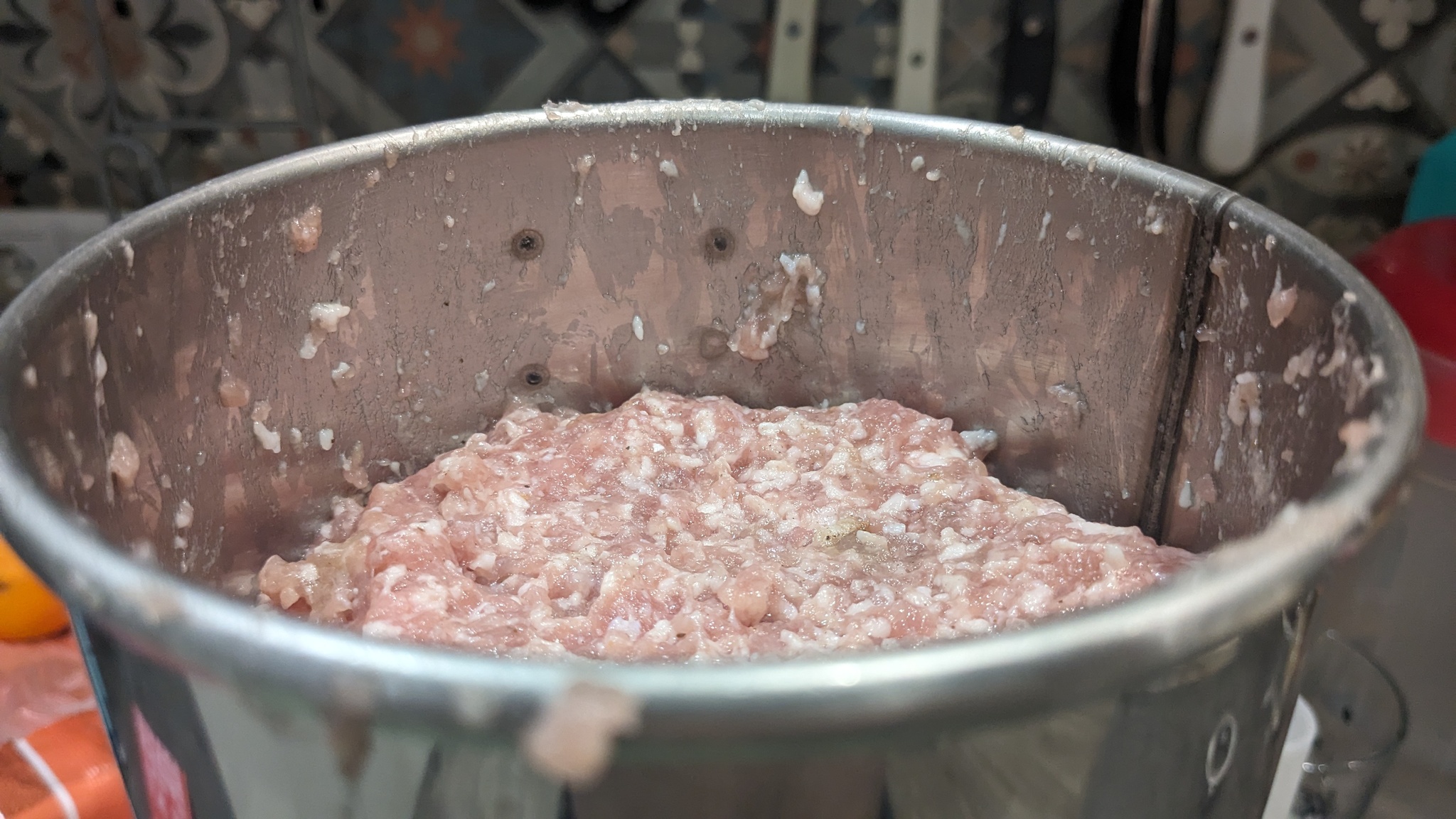Мясо охлаждаем в морозилке на часок затем в мясорубку и еще на полчасика в морозилку. Нужно это для того чтобы в процессе измельчения в фарш и последующем перемешивании жир не топился и оставался отдельными крупинками. Воду в идеале тоже подморозить полчасика. Вносим все специи и воду в фарш и хорошенько вымешиваем. Минут 10 как минимум. Будет холодно, но так надо) Я обычно вымешиваю планетарным миксером или надеваю теплые перчатки, а поверх них резиновые. Мешаем до получения тонких белковых нитей в фарше.
