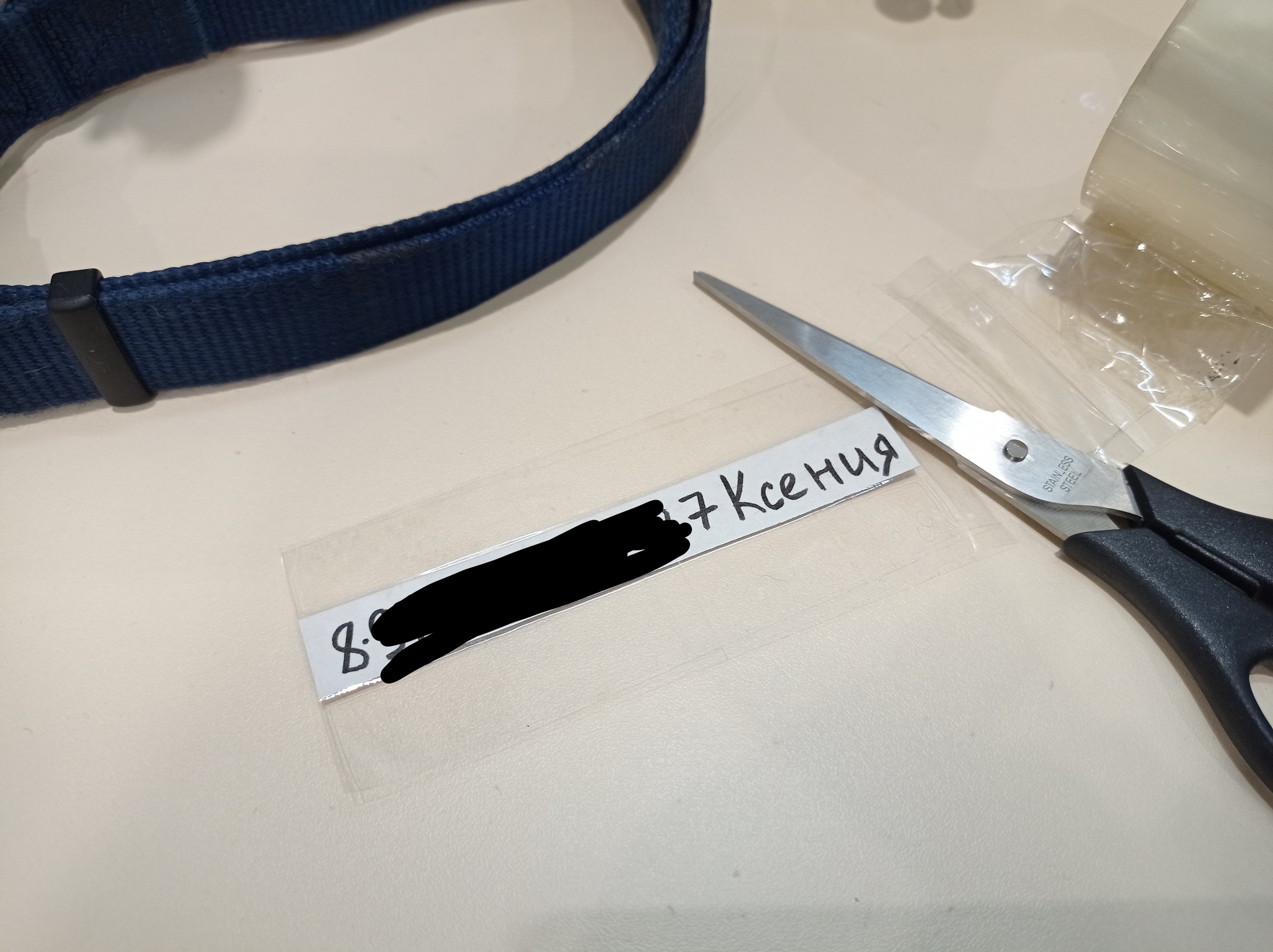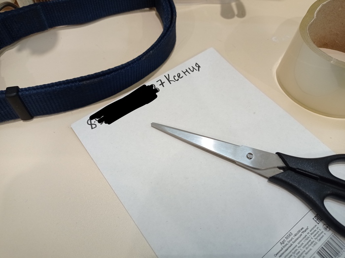 Отрезаем от скотча 3-4 кусочка, что бы полностью обернуть ширину ошейника с нахлестом. Сейчас нам нужно просто приклеить этим же скотчем адресник у ошейнику, и сделать это такая что бы скотч не размотался.