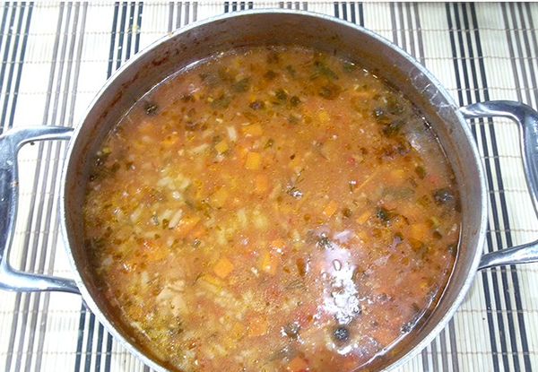 6. Продолжайте варить суп еще около 10-15 минут. За 5 минут до готовности приправьте солью и перцем. Но перед этим сначала его попробуйте, поскольку возможно соли будет достаточно от добавленной аджики. Готовый суп настаивать не надо, подавайте его к столу сразу после приготовления в горячем виде со свежим хлебом и рюмкой крепкого алкогольного напитка.....