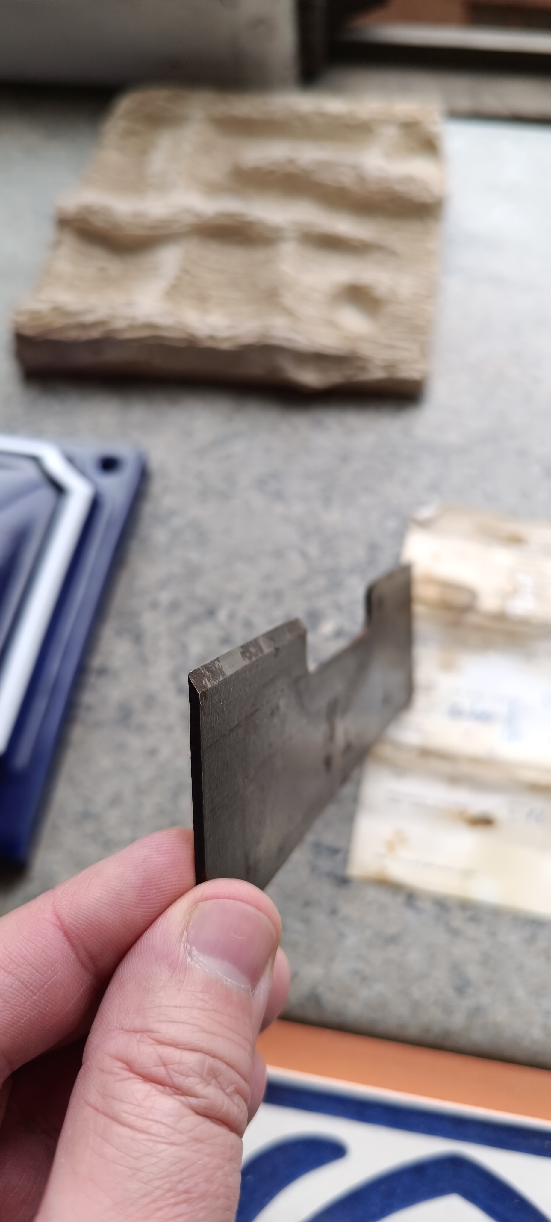 Раньше не было таких камнерезных станков, как сейчас и всяких болгарок. Возможно при помощи этого ножа раскалывали изразец. Поставил на линию, тюкнул по нему молоточком, сдвинул дальше, тюкнул снова и так пока изразец не расколется надвое. Но... Как часто его придется точить и насколько его хватит? Сомневаюсь, что надолго. Тоже бред какой-то.