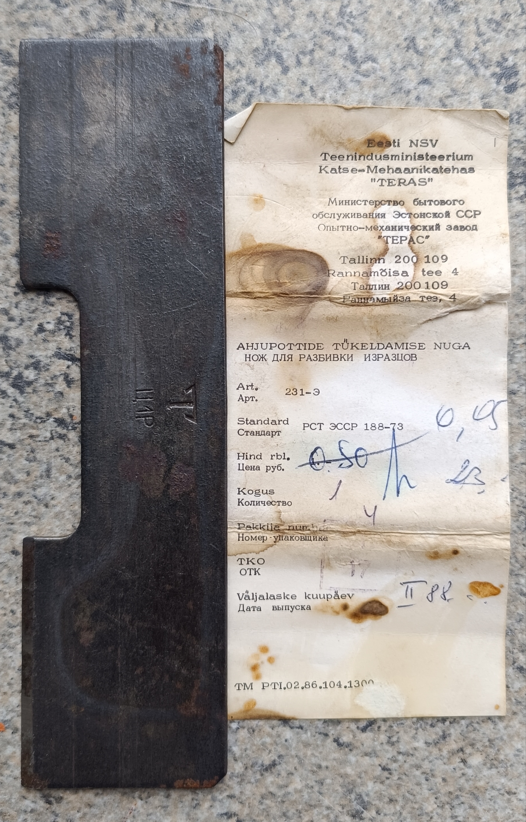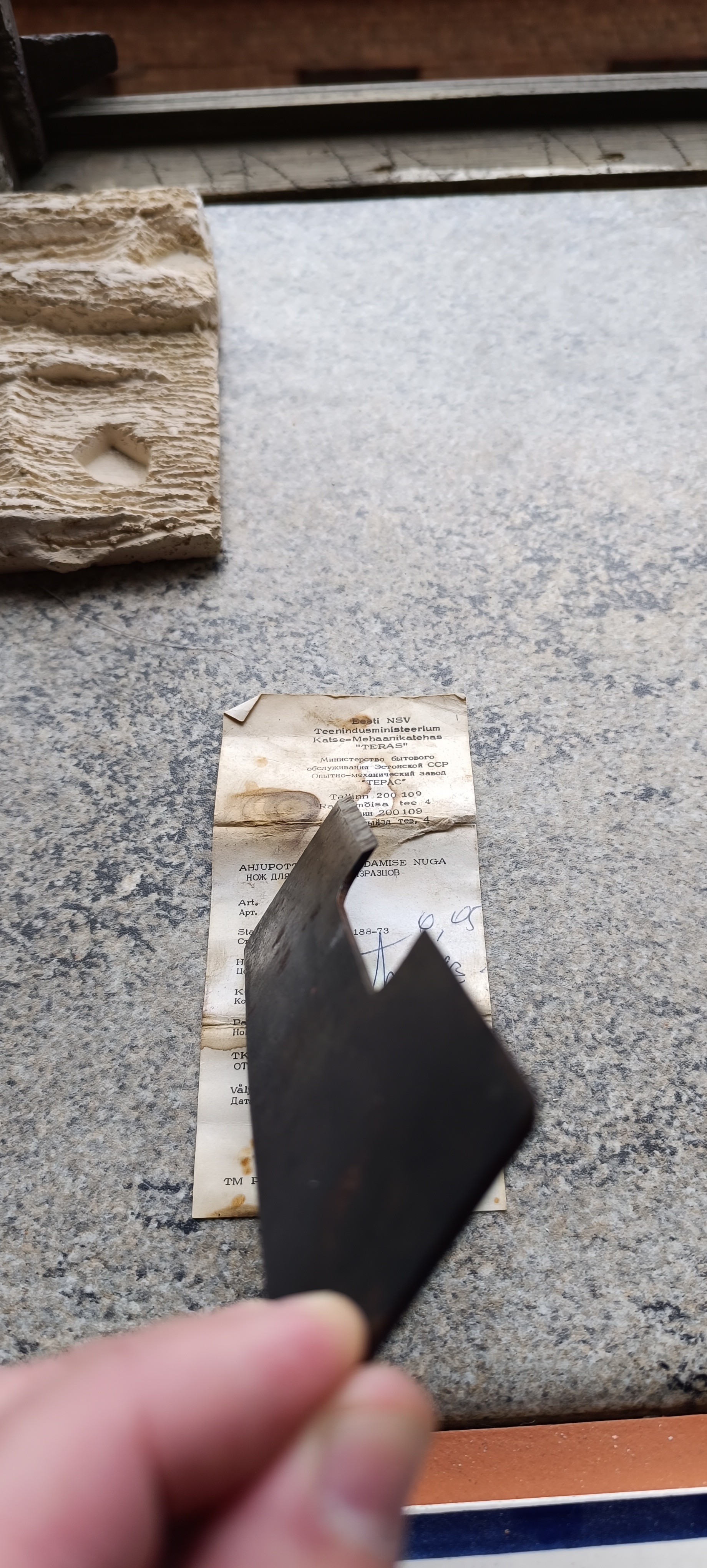 Как им пользоваться — ума не приложу. Зачем заниматься разбивкой изразцов и что это за процесс? Короче, одни загадки. Я даже не предполагал, что в период после 1973 года (скорее всего последние цифры в стандарте означают год) настолько массово использовались изразцы, что для их разбивки требовалось промышленно выпускать специальный нож за рубль!