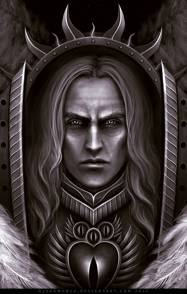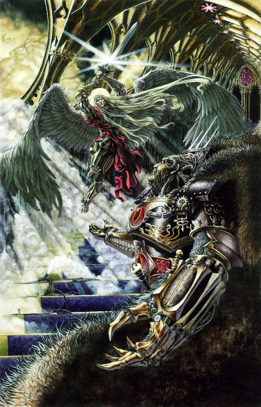 Как и Примархи, Сангвиний рос невероятными темпами, как и его крылья. Перья были белыми как у лебедя, но крылья сильными, как у самого Имперского Орла. В конце концов они выросли настолько, что он смог летать над палящей пустыней, вселяя благоговейный страх и преданность в низших существ.