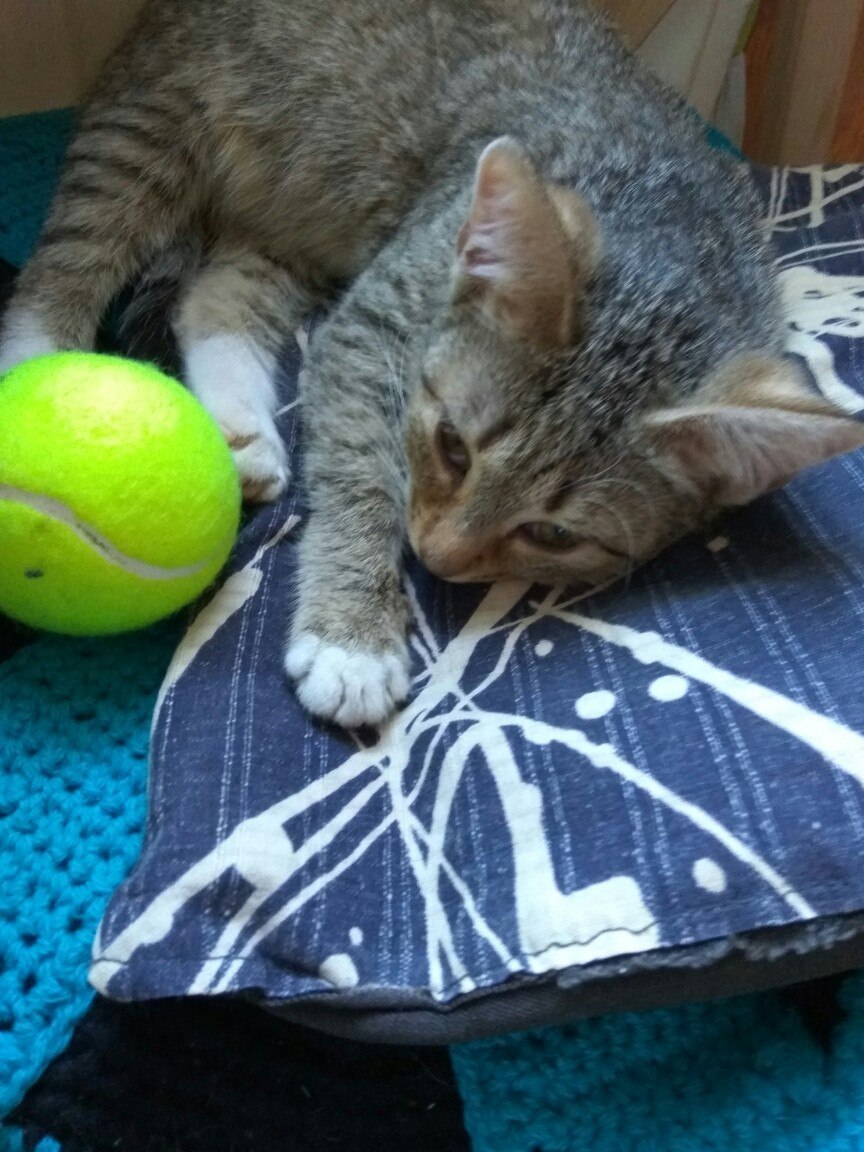 Отдам в добрые руки котенка, девочка, примерно месяца 3, подобрана из подвала, от глистов прогнали, прививок не успели сделать, к лотку приучена. Игривая, веселая, любит катать мячики.