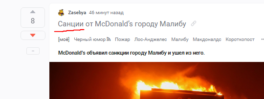 8 Zasebya 9 месяцев назад Санкции от McDonald’s городу Малибу McDonald’s объявил санкции городу Малибу и ушел из него. [моё] Черный юмор Пожар Лос-Анджелес Малибу Макдоналдс Короткопост Политика 9 2 Ещё 0